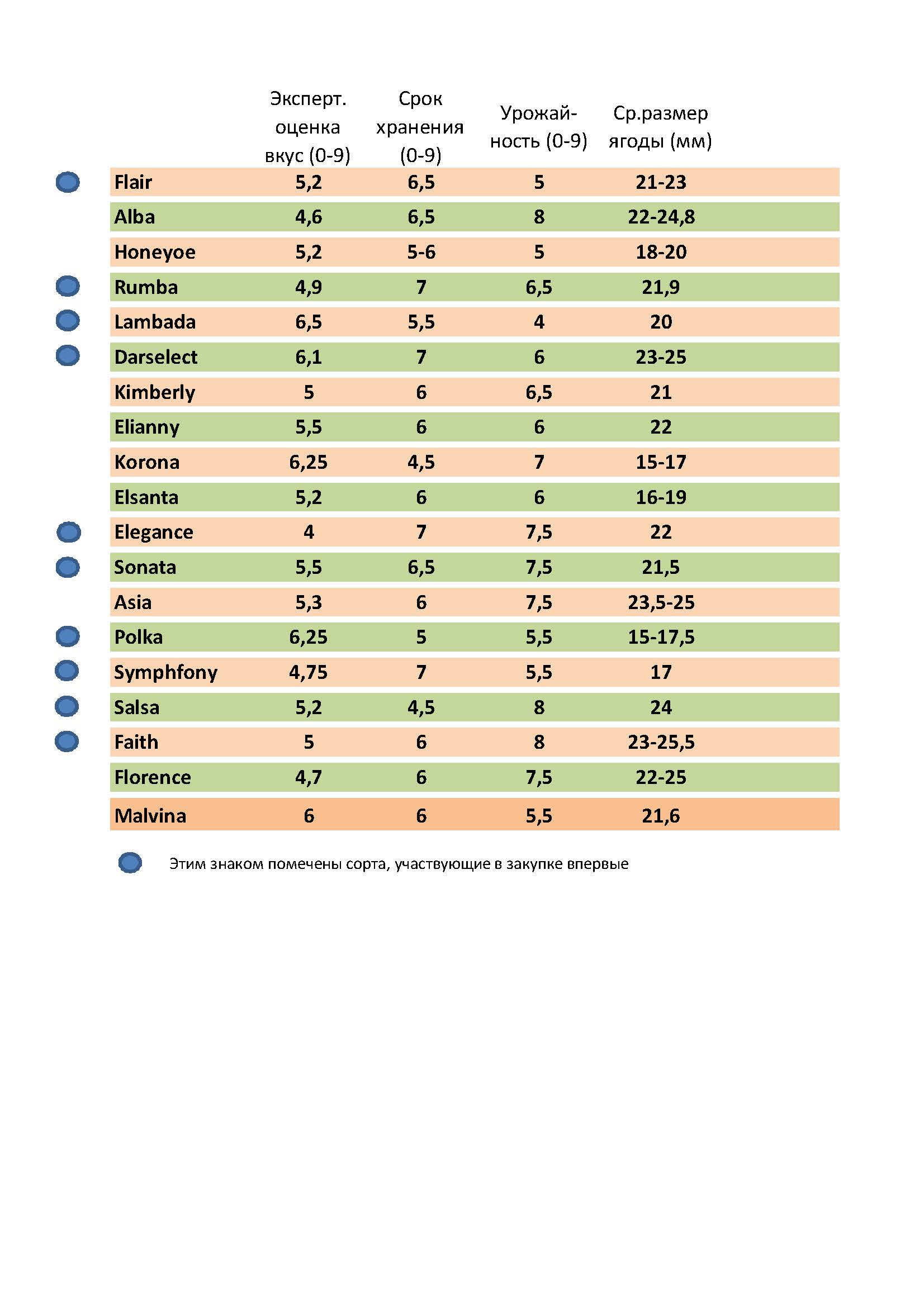 Новые сорта, участвующие в закупке впервые: КСД -Polka, Felicita, Felicia, Salsa, Sonata, Darselect,Fleurette, Sussette, Rumba,Faith, Flair, Vivaldi, Jive, Gariguette, Lambada,Elegance, Symphony, Victoriana,Fenella.