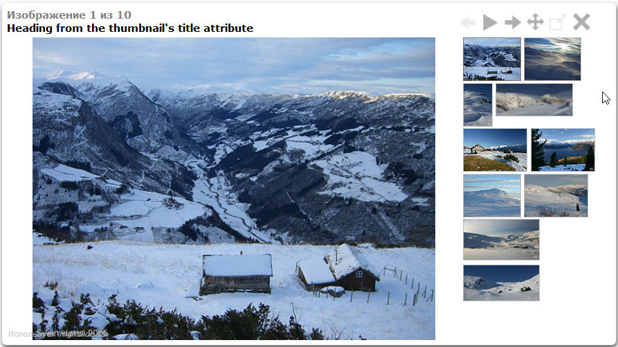 Выбрали, внешне ничего не изменится. Кликаем по фотке справа. Увидим стрелки Следующая, Предыдущая, Слайдшоу, На весь экран. Они могут быть внизу, вверху. Превьюшки могут быть не видны, быть слева, справа и тд. (на вкладке Gallery есть еще куча настроек)