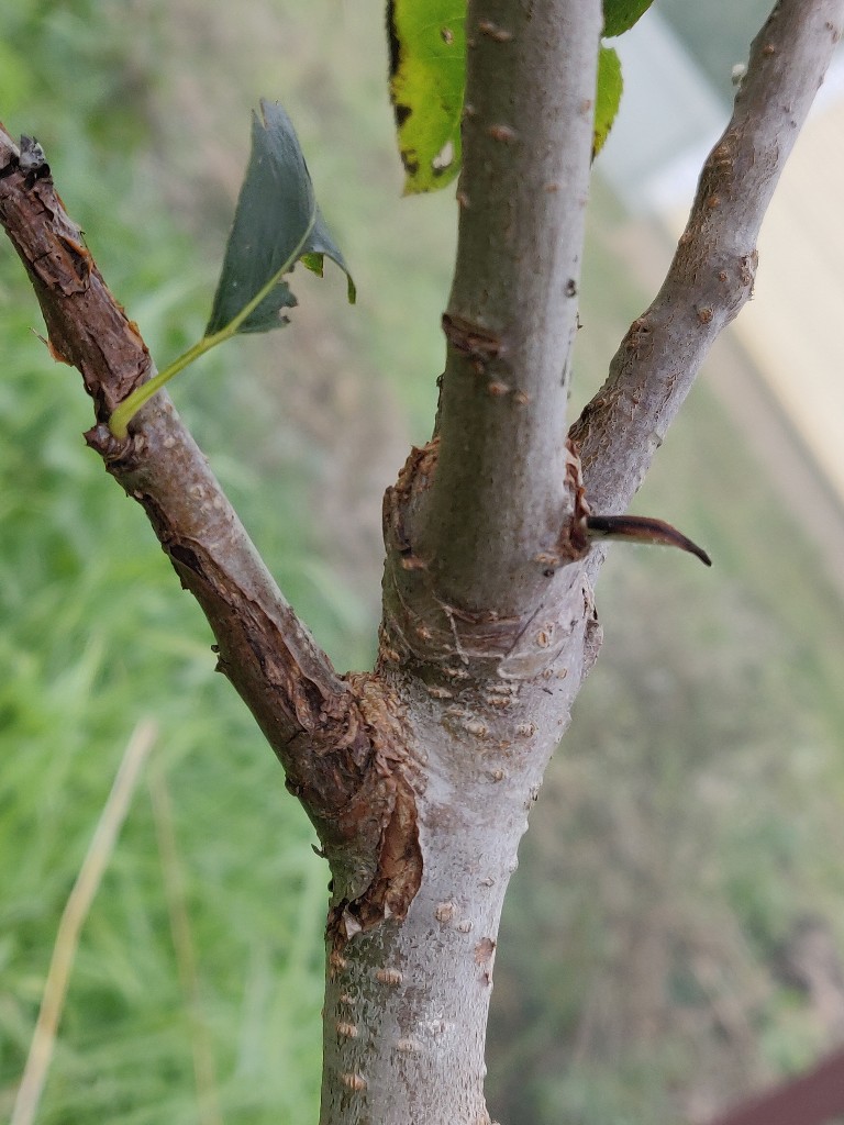 А вот четырехлетка Перуна(тоже из МСХА, брал двухлеткой для эксперимента на скелет источник черенков в дальнейшем ) расстроила в этом году состоянием коры и однолетнего прироста после этой зимы. Явно солнечные ожоги и обмерзание. Хотя два года я за ней очень бережно ухаживал.