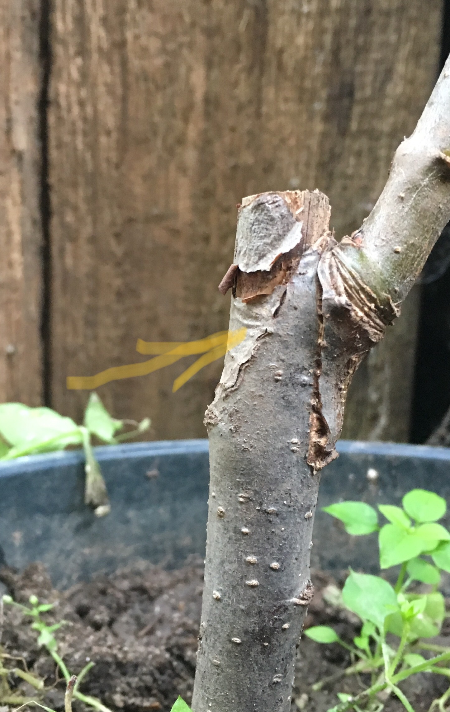 торчит кусочек коры подвоя, за который вставили почку, не криминально мне кажется, но как то необычно .