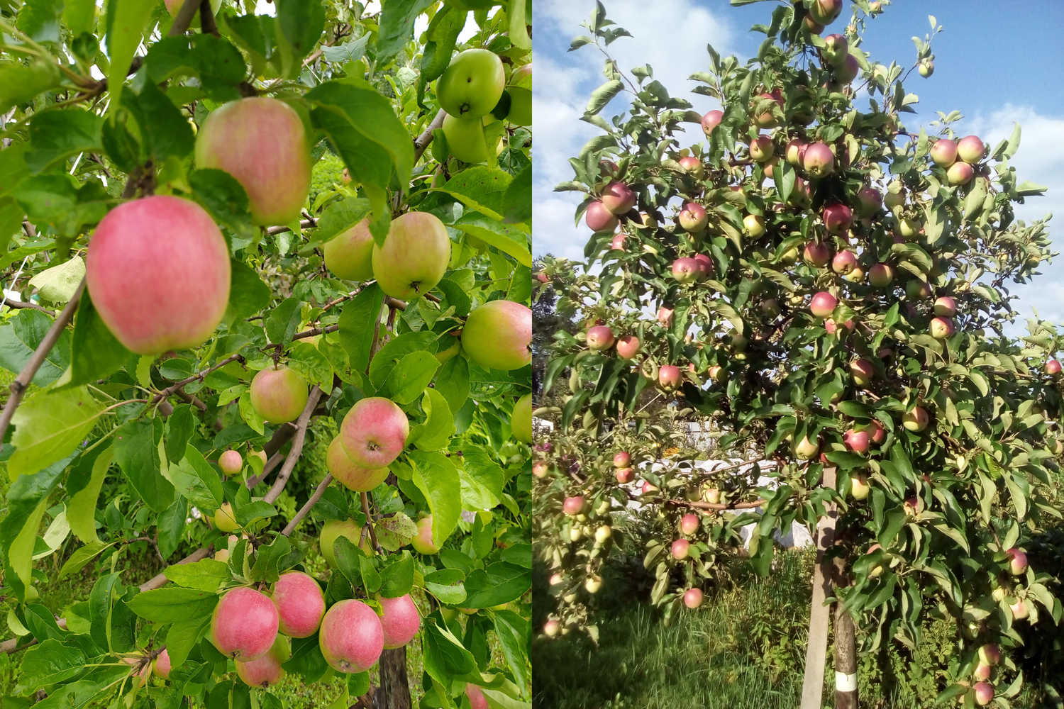 Сорт Афродита изначально был прививкой в кроне, видимо, поэтому ни разу не подмерзал и ежегодно радует хорошими урожаями. Левая часть кадра сделана сегодня, а правая – ровно год назад: