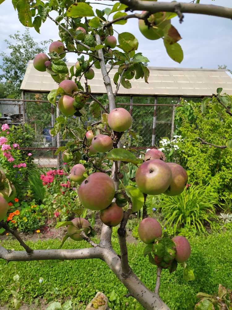 Союз,абсолютно чистый от парши и прочих болячек,поражает размерами плодов.Яблоки начали окрашиваться.