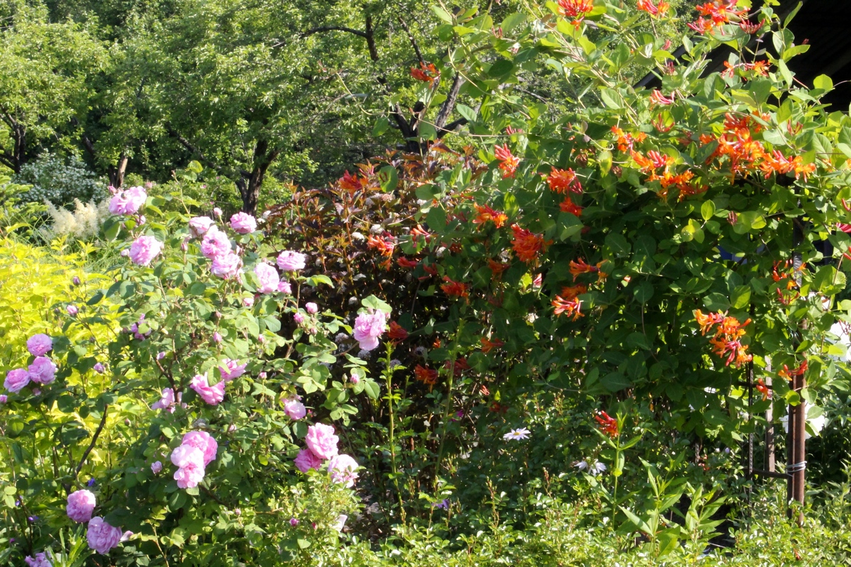 Татьяна, если ТЕБЕ не нравится, то убери ее подальше с глаз.Понятно, что взрослая, и копать тяжело. Попроси сынулю пересадить две розы. При пересадке тоже обрезать ветки. Зачем тебе роза однократного цветения в таком месте хорошем? Сортов море сейчас. Найдешь то, что будет радовать все лето и осень. Посади какой-нибудь шраб (это кустовая роза по современной класификации). У тебя здесь смешение теплого (жимолость) и холодного (лимонный цвет куста) происходит. Плюс присутствует езе светро-розовый (холодный). Ты же говорила, что тебе это сочетание (желтый и розовый) не нравится в спирее. Вот оно тебе и режет глаза. Я бы убрала. Но решать тебе.