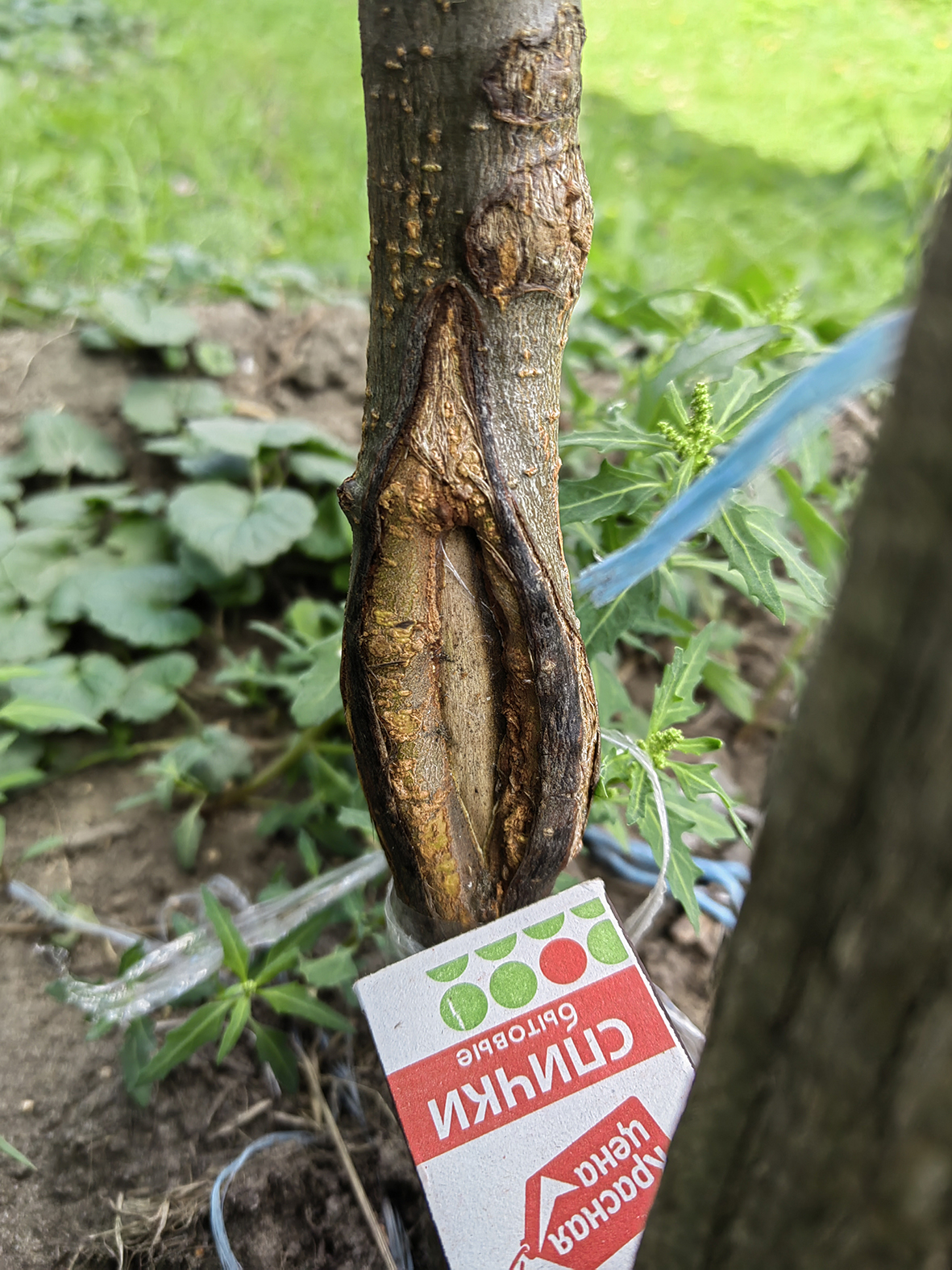 Весной обнаружил трещину на груше, промыл кисточкой средством FAIRY, замотал стрейч пленкой.Под пленкой всегда конденсат, влажно,светло.Вот сфотографировал сегодня.Перемотал повязку.Наверно можно здесь использовать стимуляторы, даже подавать шприцом сквозь пленку, и все на виду.Но и без стимуляторов хорошо зарастает.Иногда использую пленку вместо содового вара, заматываю ранку, результаты всегда хорошие.Zaryanka писал(а): ↑10.08.2022, 09:44 И вместо обычной дезинфекции и обмазки навозом с глиной, использовала три стимулятора: цитокинины(Цитокининовая паста) + ауксины(Корневин) - это для деления клеток, и хлорэтилфосфоновую к-ту(Дозреватель) - это для вызревания клеток. Если у кого чего-то подобное применялось, поделитесь - как результат.