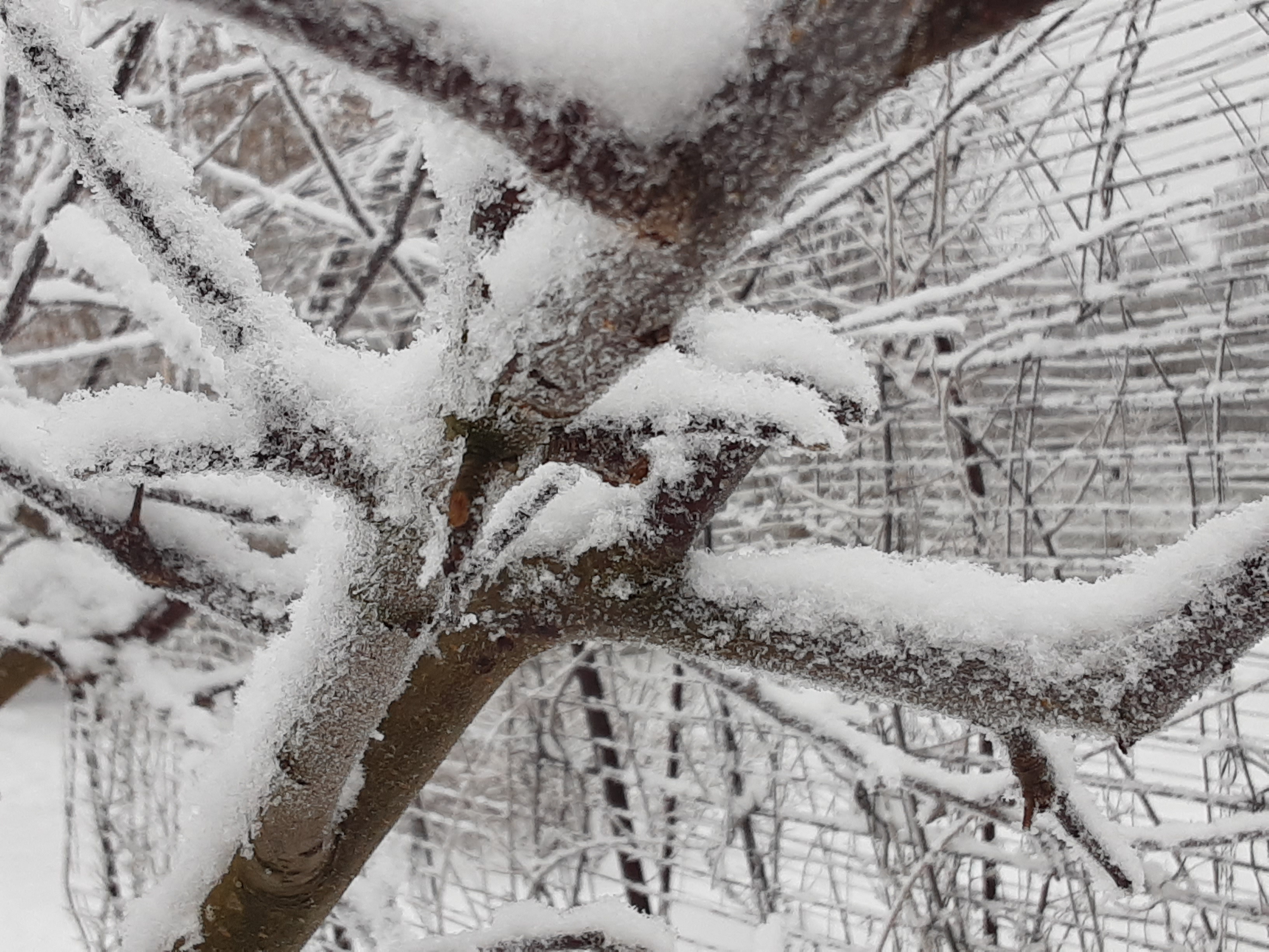 У нас выпало снега ок. 10 см. на незамёрзшую землю и пару ночей были морозы ок. 10 гр. Сейчас всё под небольшим слоем льда, но он, всё-таки, на ветках не сплошной.
