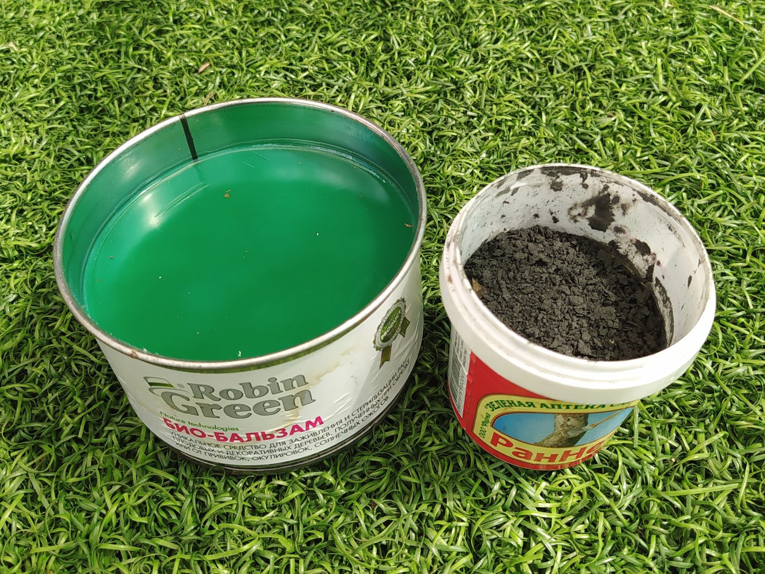 Начал выпиливать и выстригать сухостой, образовавшийся в саду после зимы. Вспомнил про бальзамы для обработки спилов, которые были где-то в сарае. Интересен результат зимовки этих чудо-снадобий. Робин Грин как на момент покупки, а РанНет превратился в крупнозернистый черный порошок: