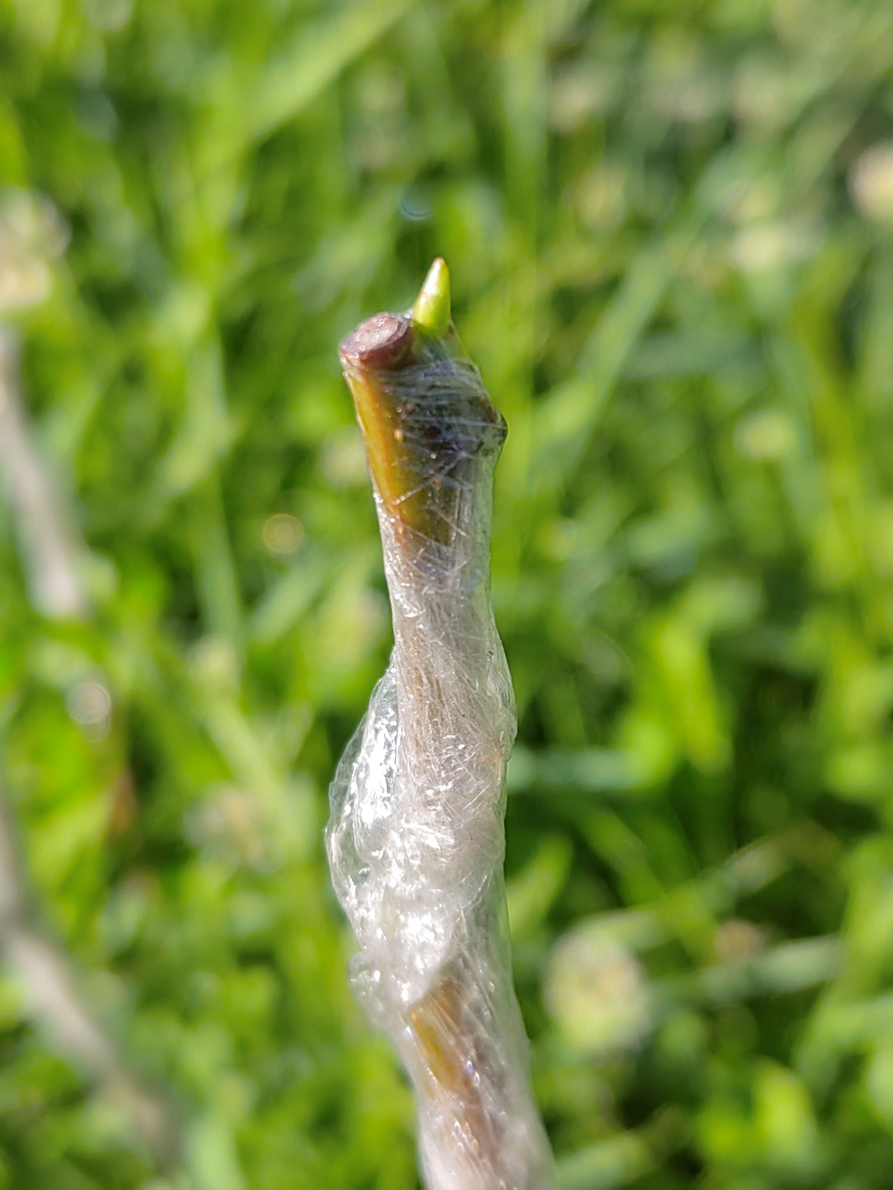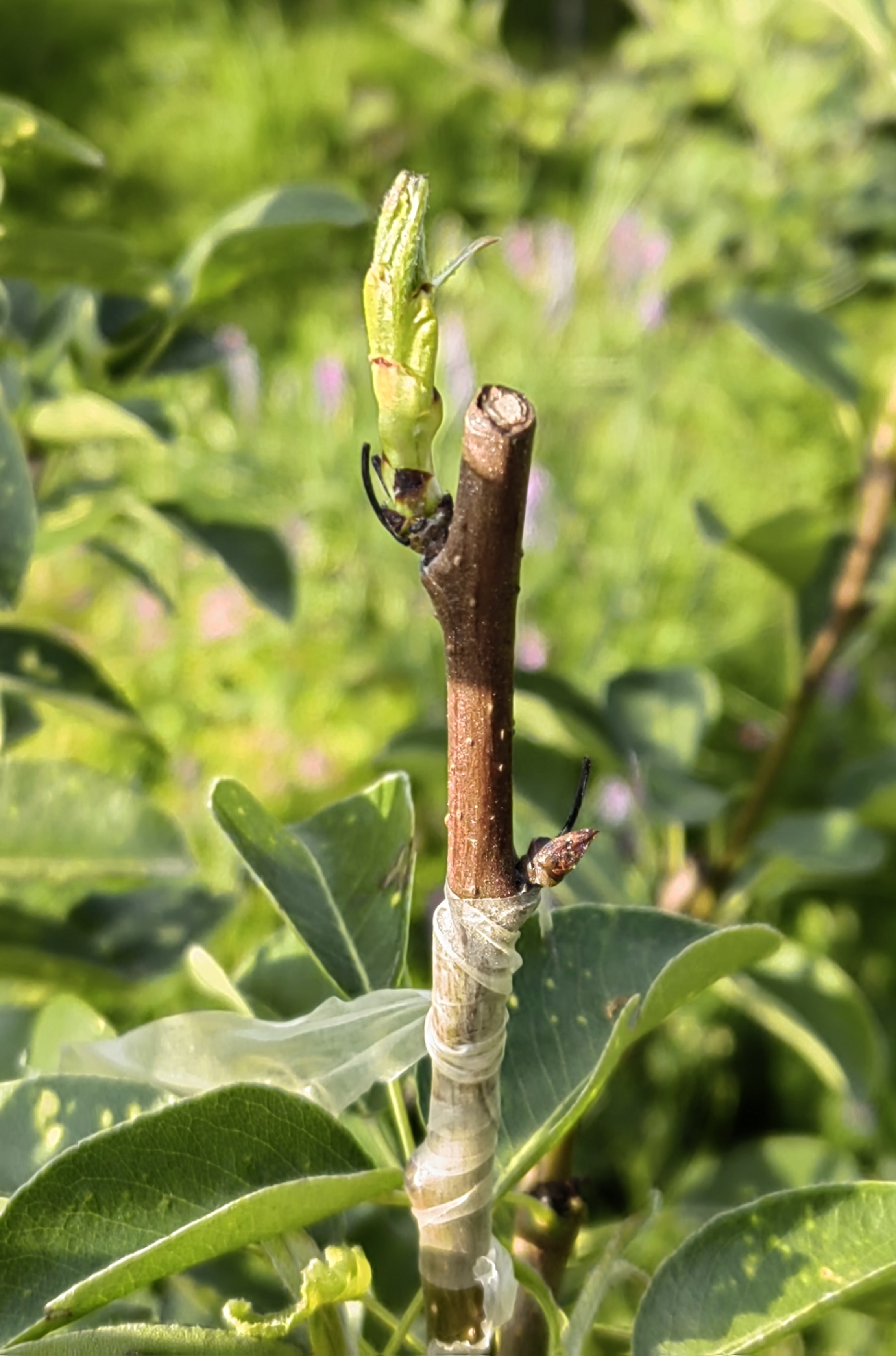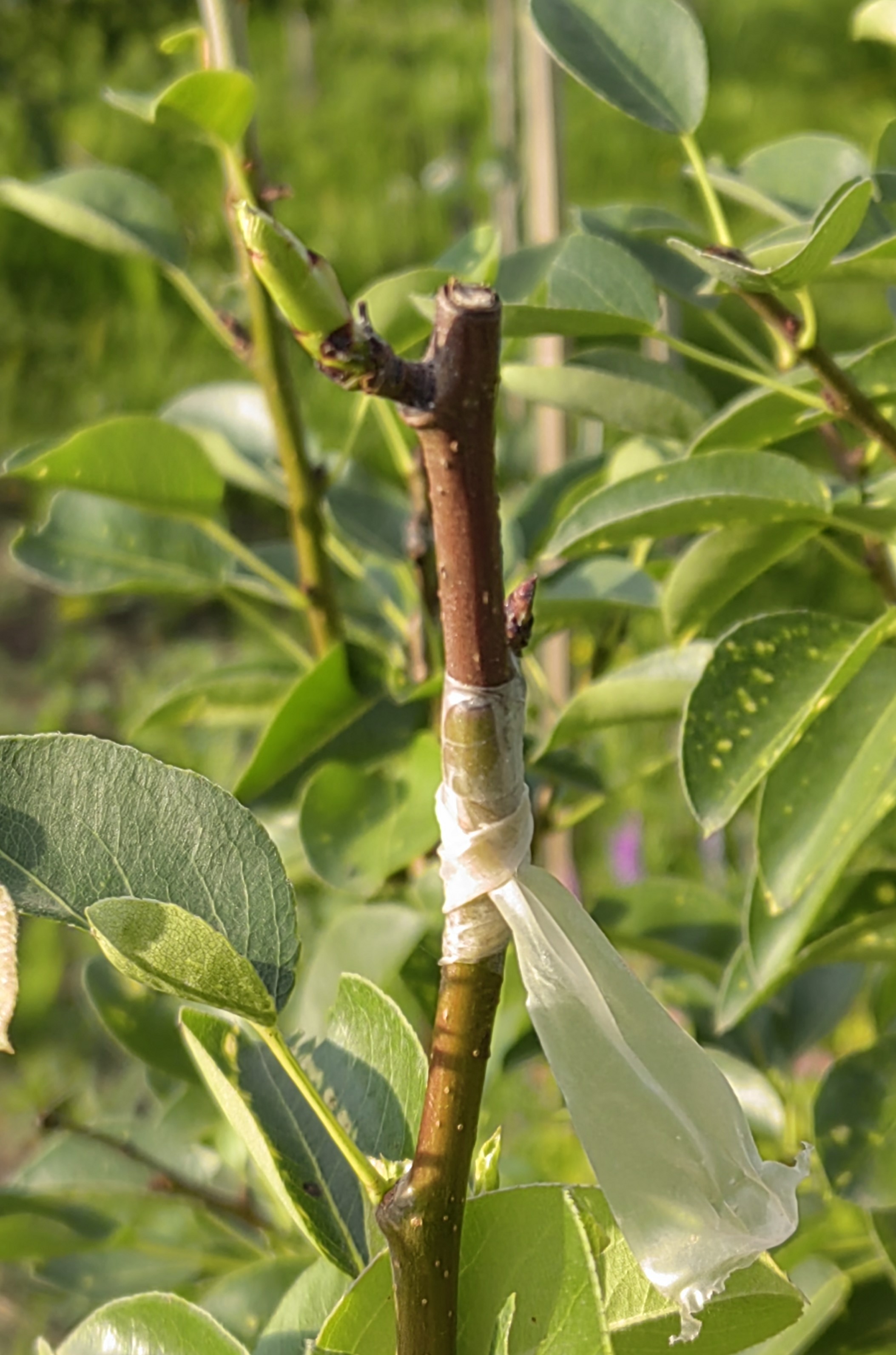 я не очень понимаю механизм этого. Если почка не стартует летом на побеге этого года, почему она стартанет, срезанная и примотанная к другому побегу? Я не видел такого на яблоне.