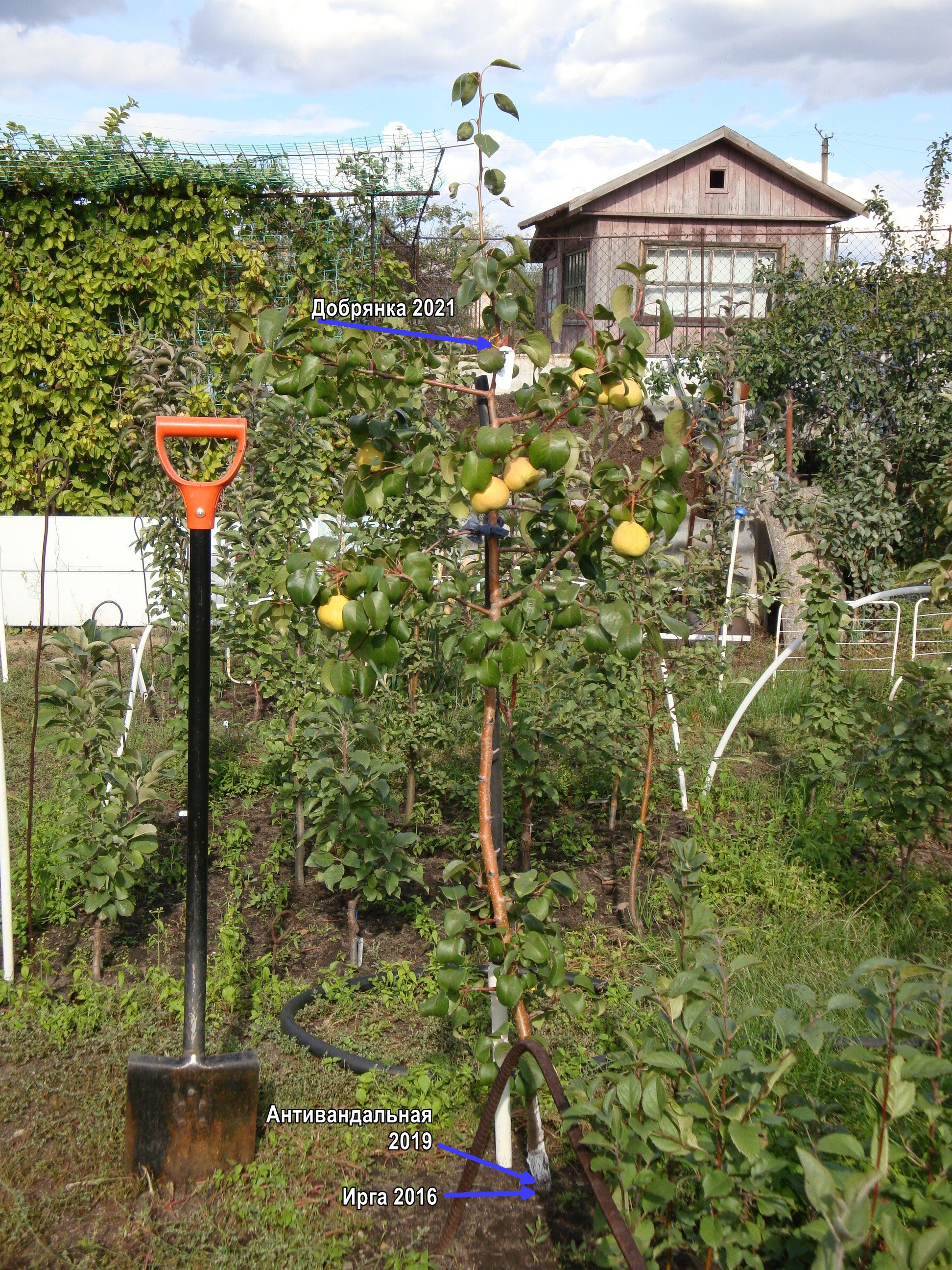 kanojer, дело в том, что я прививаю грушу в корневую шейку сеянца ирги. При недостаточной совместимости корни ирги не хотят питаться тем, что им предлагает грушевая прививка. Происходит постепенное отравление подвоя, саженец болеет и через 2-4 года гибнет. Мне кажется, я подобрал гибрид, совместимый одновременно с иргой и вкусными сортами груши. Прививка Добрянки уже второй год, весной привью Свердловчанку. (Снимок сделан в 2021 году)