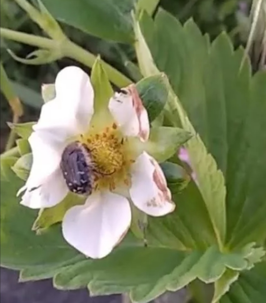 Новая напасть на клубнику (садовую землянику), как оказалось олёнка мохнатая. Облюбовала кусты у которых цветы выше листвы, сжирает тычинки и выедает цветоложе,
