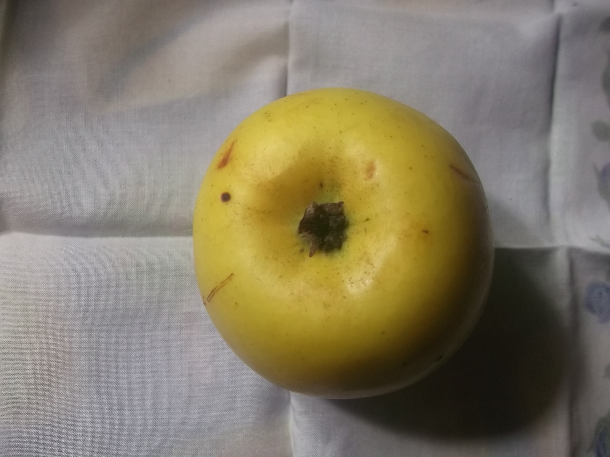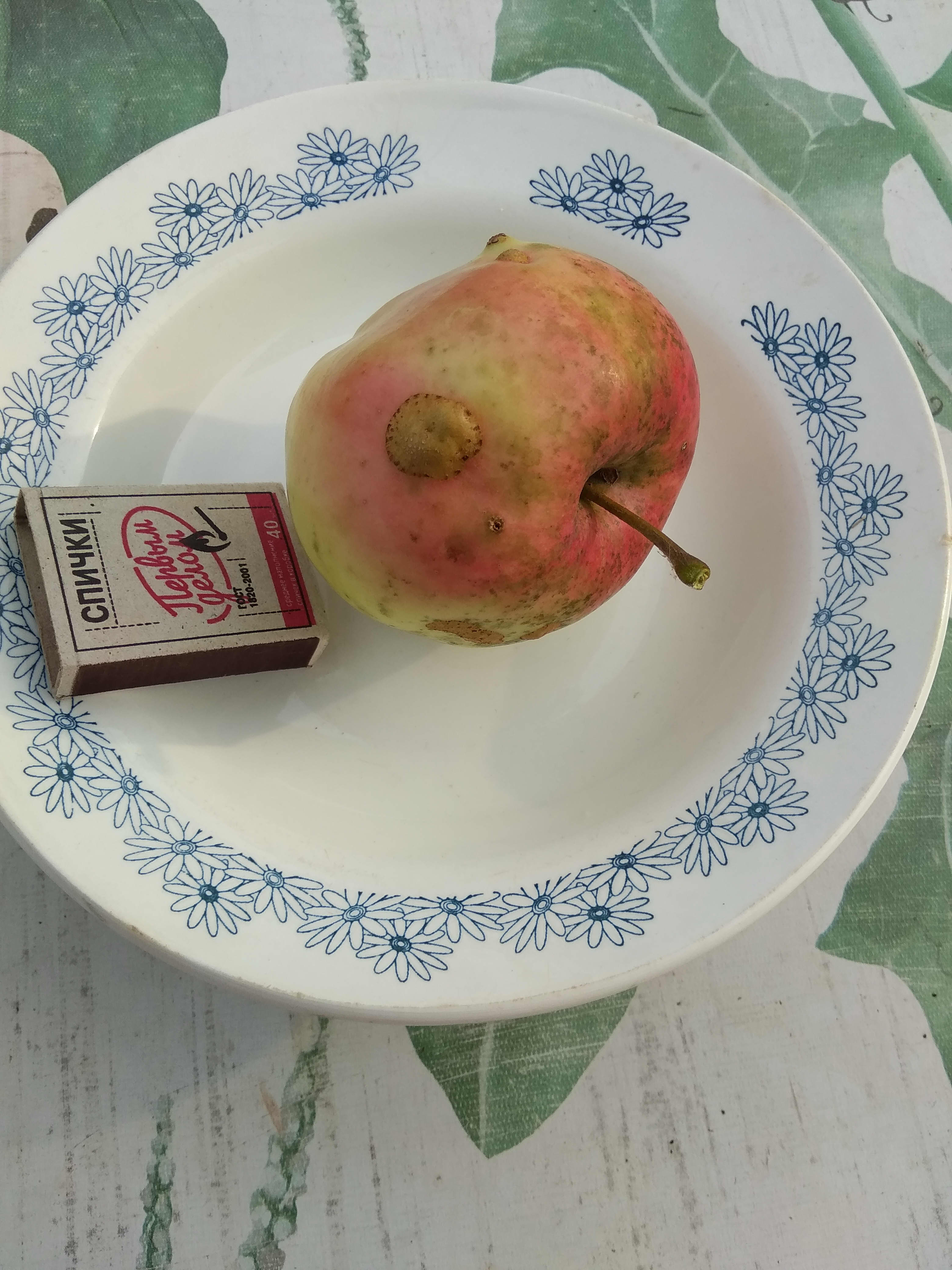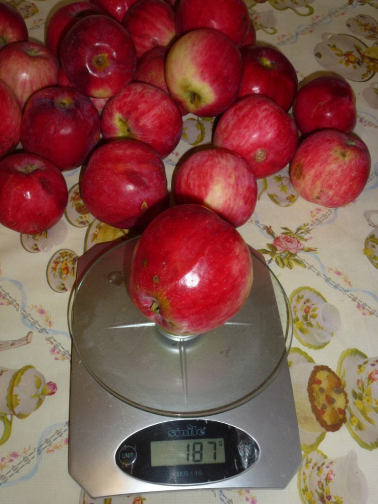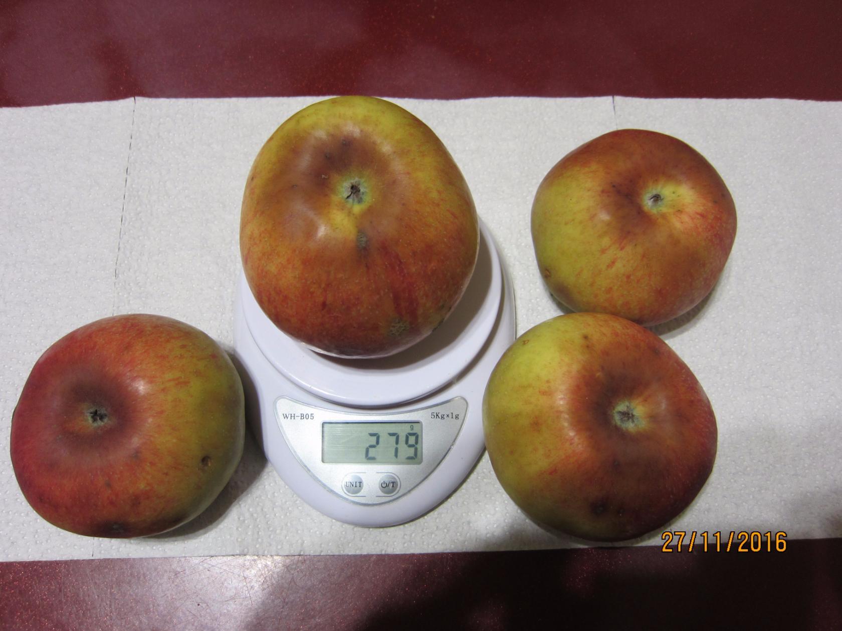 Это урожай 2016 года, год был нормальный. Вес был 250 грамм, но может потому что много цвело, но завязалось всего 4 яблока. Смущает бугорок на воронке и в описании покровная окраска: Основная окраска светло-зеленая, покровная – в виде интенсивного красного полосатого румянца, занимающего около половины поверхности плода - у меня не было никаких полосок, просто красный румянец. Так же в холодильнике хранилось только 1 месяц, потом появились коричневые точки и мы яблоко съели, а в описании: могут быть сохранены в условиях холодильника до ноября, а иногда и до января.