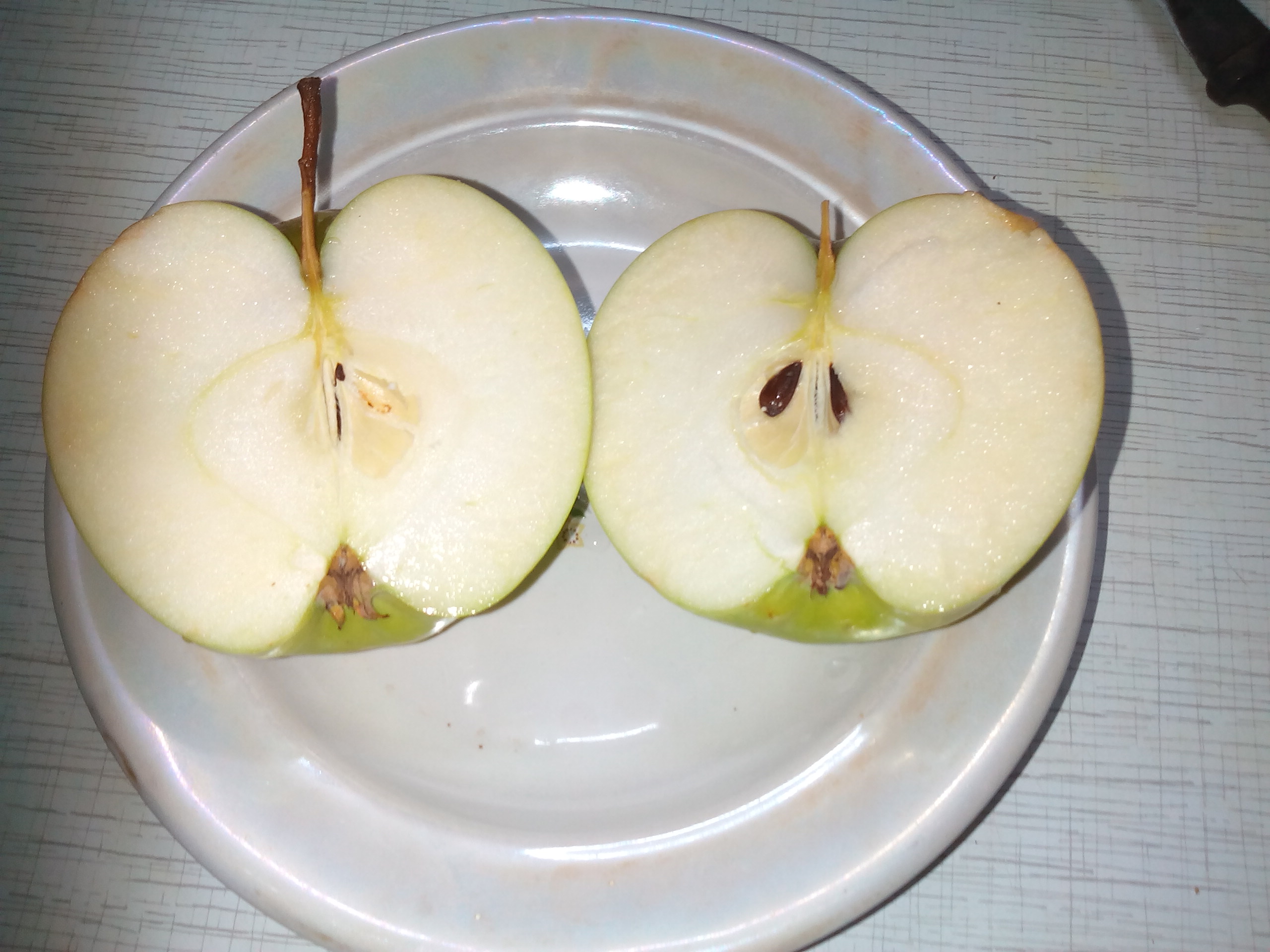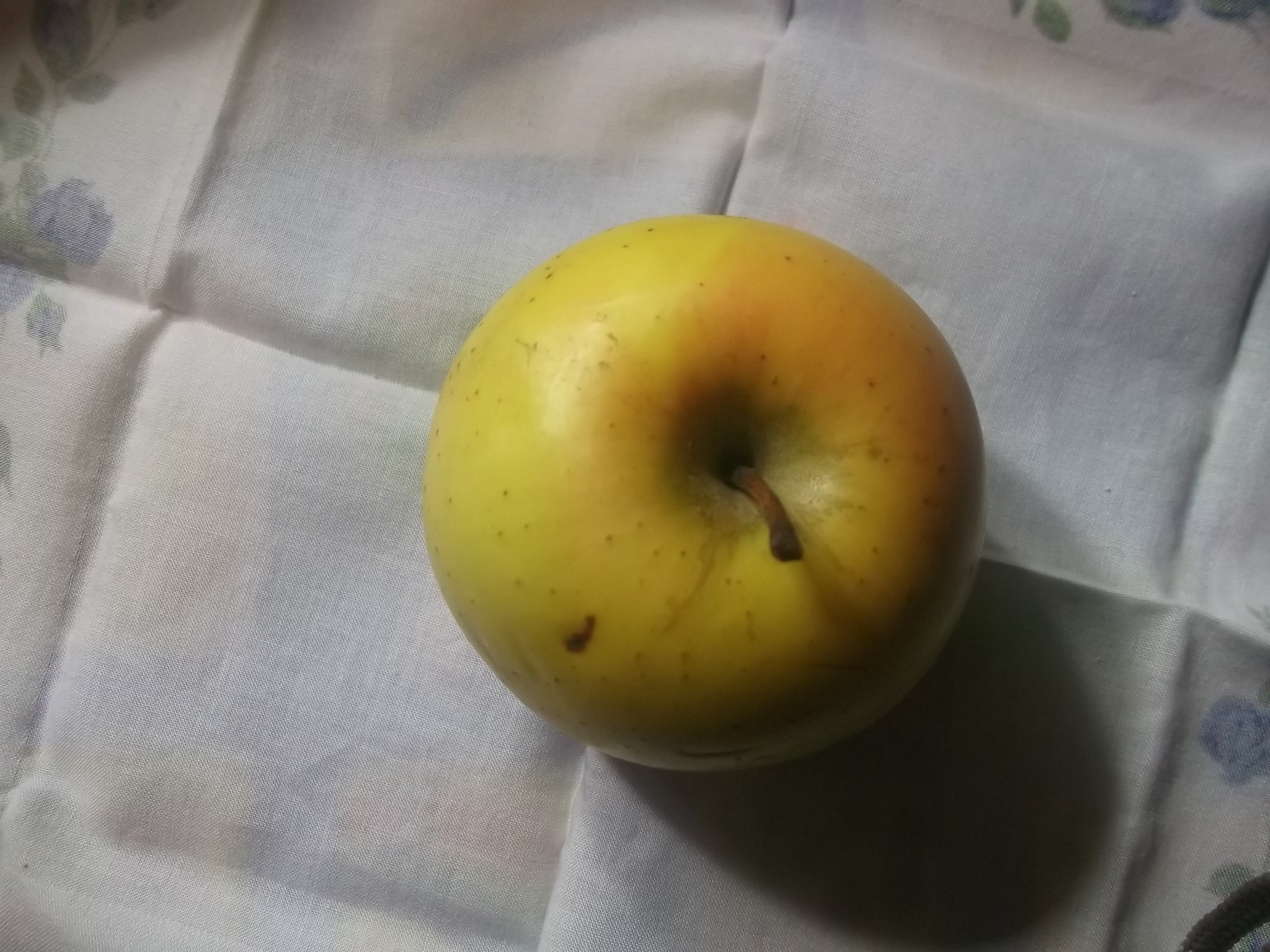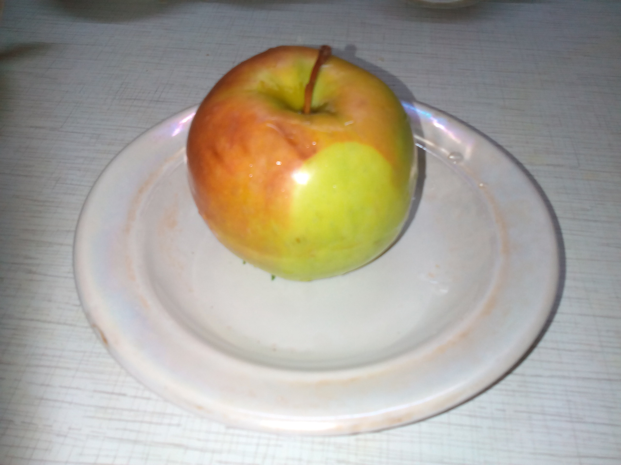 Это урожай 2016 года, год был нормальный. Вес был 250 грамм, но может потому что много цвело, но завязалось всего 4 яблока. Смущает бугорок на воронке и в описании покровная окраска: Основная окраска светло-зеленая, покровная – в виде интенсивного красного полосатого румянца, занимающего около половины поверхности плода - у меня не было никаких полосок, просто красный румянец. Так же в холодильнике хранилось только 1 месяц, потом появились коричневые точки и мы яблоко съели, а в описании: могут быть сохранены в условиях холодильника до ноября, а иногда и до января.