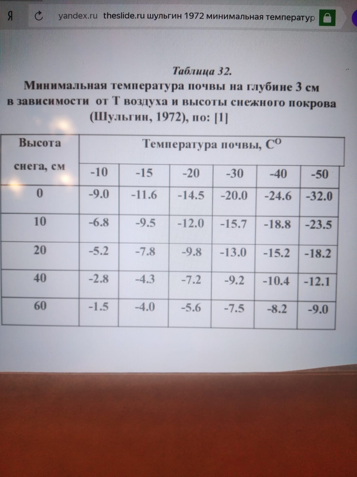 С одной стороны - хорошо, что влажная почва и сугроб в 30 см. Те же условия были и 21-22 декабря, когда t опустилась до минус 27гр.Потому, что если по таблице Шульгина посчитать свой случай, то получилась бы t почвы у корней - минус 10,32 гр.(критическая для корней груши по Седову -8...-10гр; для дом. сливы, алычи по Еремину -10...-12 гр). Но значения в таблице - для сухой глины. У нас - влажная, влажная медленнее охлаждается и делает плавными суточные колебания. То есть, влажная почва, можно сказать, спасла корни от вымерзания. Я надеюсь, что эти самые минус 27 не стали критичными для яблони по 1-му компоненту зимостойкости( хотя, об этом есть в книге Седова). Есть три причины надеяться, что обошлось.