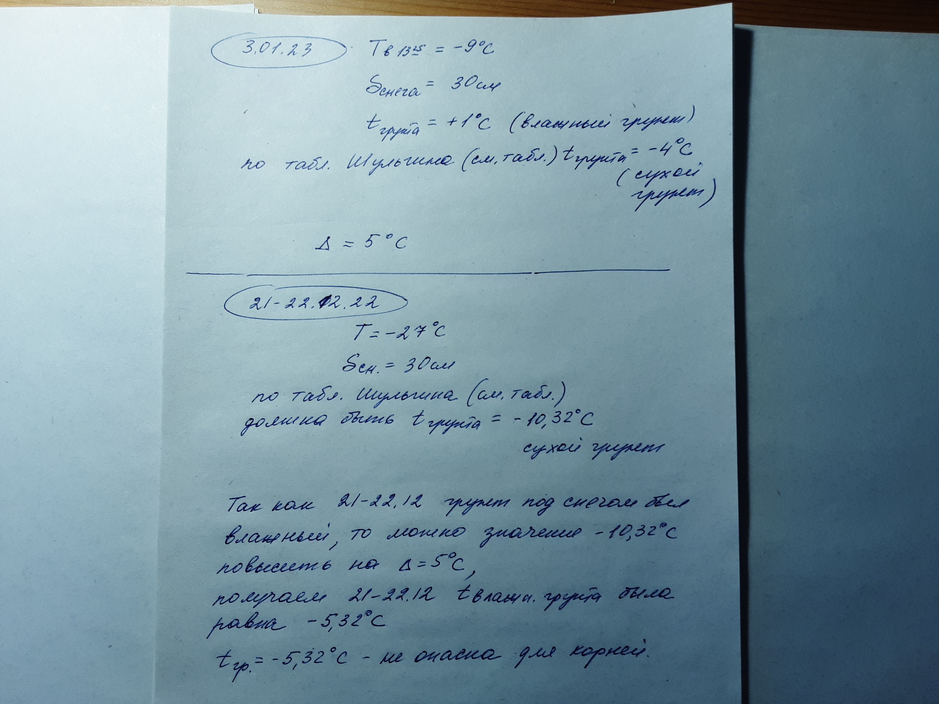 Потому, что если по таблице Шульгина посчитать свой случай, то получилась бы t почвы у корней - минус 10,32 гр.(критическая для корней груши по Седову -8...-10гр; для дом. сливы, алычи по Еремину -10...-12 гр). Но значения в таблице - для сухой глины. У нас - влажная, влажная медленнее охлаждается и делает плавными суточные колебания. То есть, влажная почва, можно сказать, спасла корни от вымерзания. Я надеюсь, что эти самые минус 27 не стали критичными для яблони по 1-му компоненту зимостойкости( хотя, об этом есть в книге Седова). Есть три причины надеяться, что обошлось.