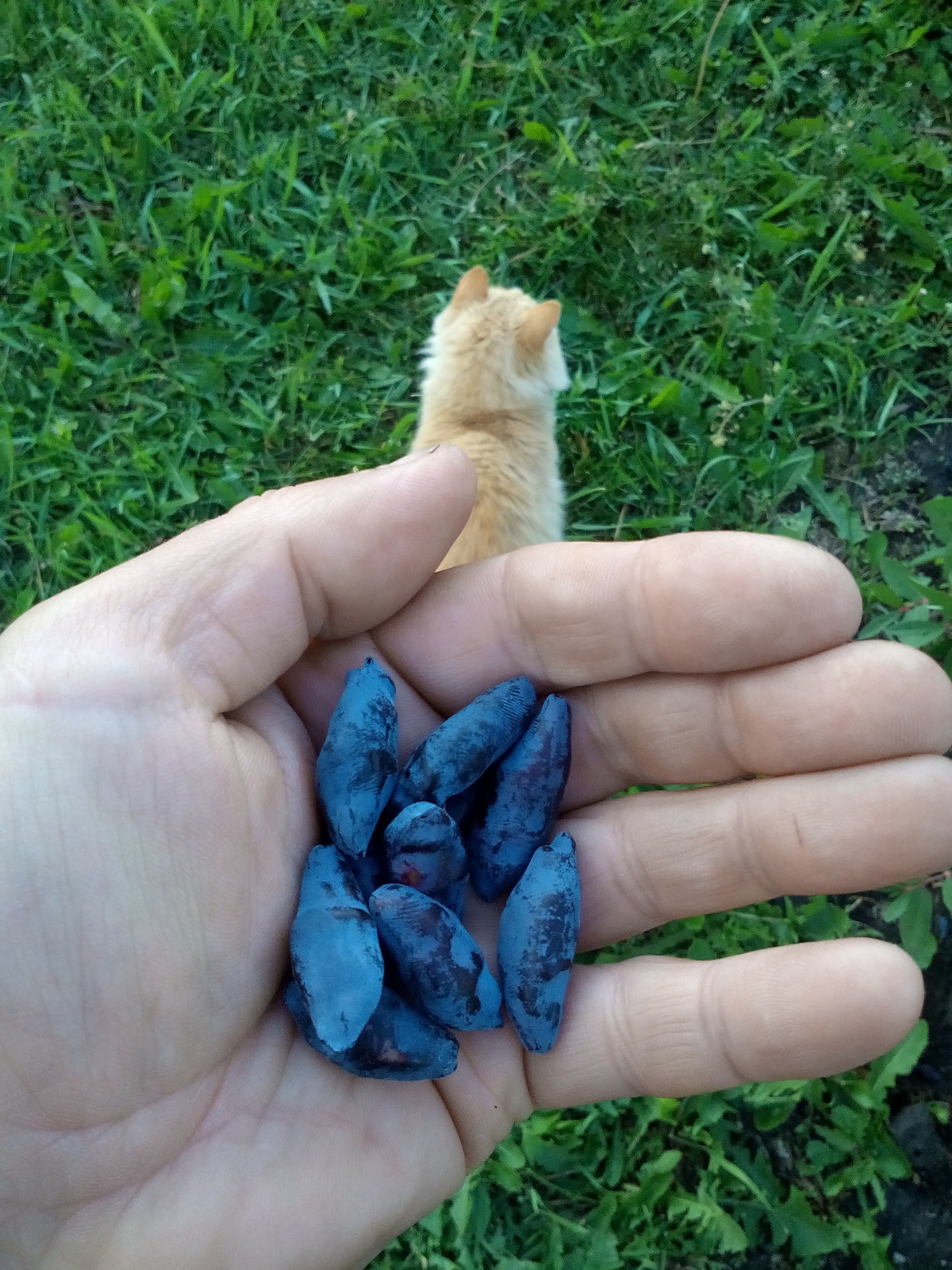 Закрыл сезон жимолости. На даче мне помогли - "Восторг" и "Сибирячку" обобрали. "Сибирячки" нашел немного ягод у основания куста. В длину довольно большие, до 3 см., но уж очень узкие, змееобразные. Размерчик не очень. Ягода сладкая, с небольшой горчинкой в этом году. "Уссульга" в деревне понравилась больше, она еще и крупнее. "Дочь Великана" в деревне повисела еще недельку, стала чуть лучше, но все равно вкус оцениваю по этому году не выше 4,2-4,3. По мере созревания ягода стала мягкой и сильно продавливается при сборе. Ощущения такие, что сейчас ты ее раздавишь пальцами. Но, даже если вкус не станет лучше, то для варенья такая ягода хорошо пойдет, так что особо не жалею. "Югана" еще поднабрала вкуса и я бы поставил ей в этом году 4,8 балла. Вкус, размер ягоды, сила роста куста, вертикальный габитус - все это достоинства "Юганы". Безоговорочное I место в этом сезоне.