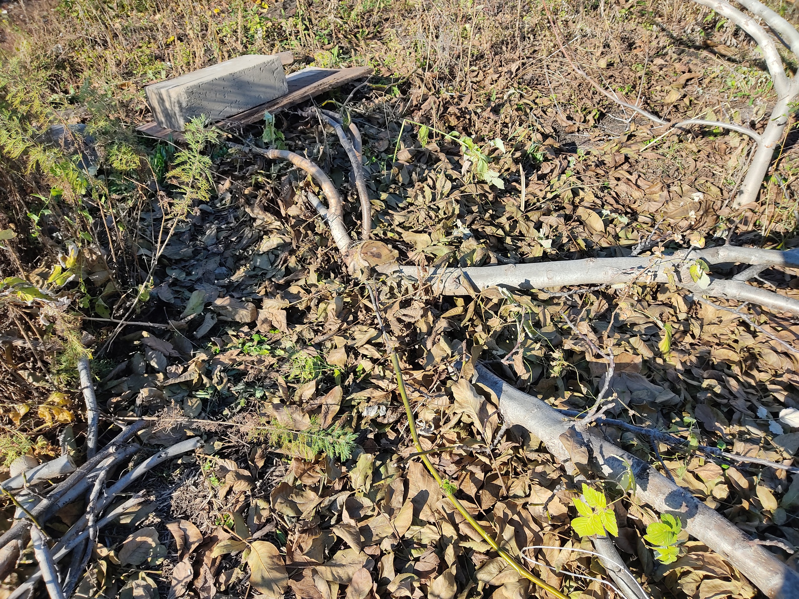 Пригибаю ветви к земле и придавливаю их гнётом (газобетонные блоки). Ветви стали настолько толстые, что в этом году для их придавливания к земле был необходим вес двух взрослых мужчин. То есть на следующий год пригибка ореха обещает стать ещё сложнее, потому следующей осенью я просто спилю эти ветви, пусть растение обновляет крону. Сейчас уже пришлось избавиться от короткого вертикального ствола, так как пригибать отходящие от него ветви стало почти невозможно, а эта срединная конструкция из ствола и ветвей сильно поднимает вверх уровень укрытия, что снижает качество зимней теплоизоляции. Так что на эту зиму остались только те ветви, которые относительно хорошо ложатся на землю. Впереди будет ещё укрытие этого грецкого ореха растительной ветошью, это будет после прихода лёгких отрицательных температур, прямо сейчас укрывать не стоит, так как ещё плюсовые температуры, под слоем ветоши всё будет преть. А потом на укрытие ещё снега навалит и зимовка будет совсем комфортной.