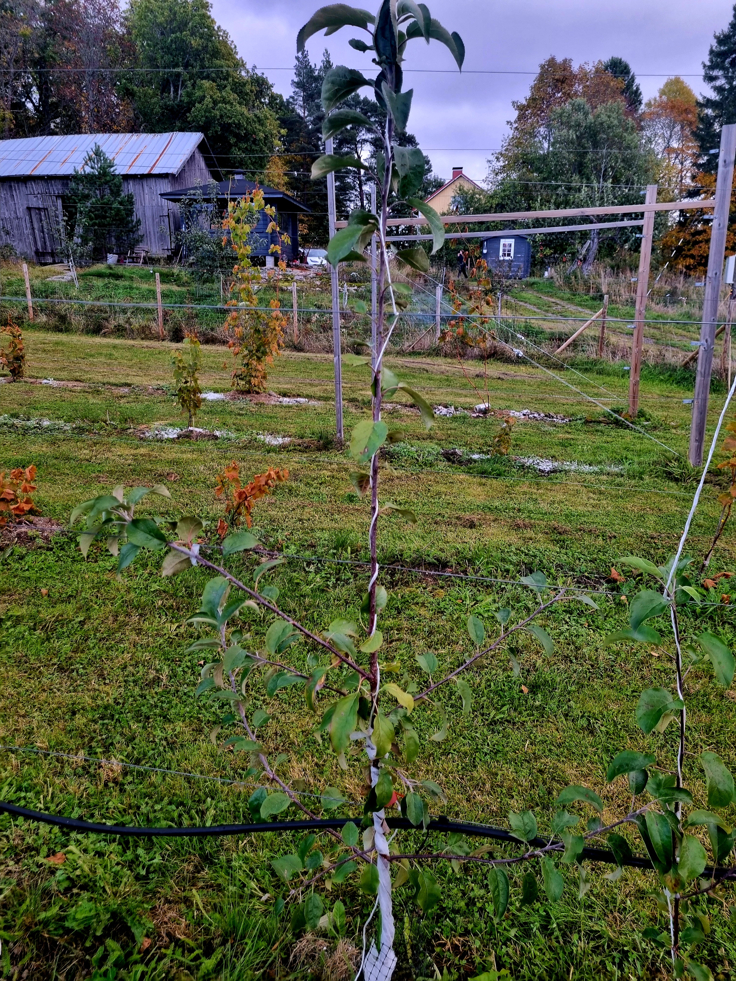Эксперементирую с подвязками. Помоему это отличный и дешёвый способ крепить яблоню к шпалере.