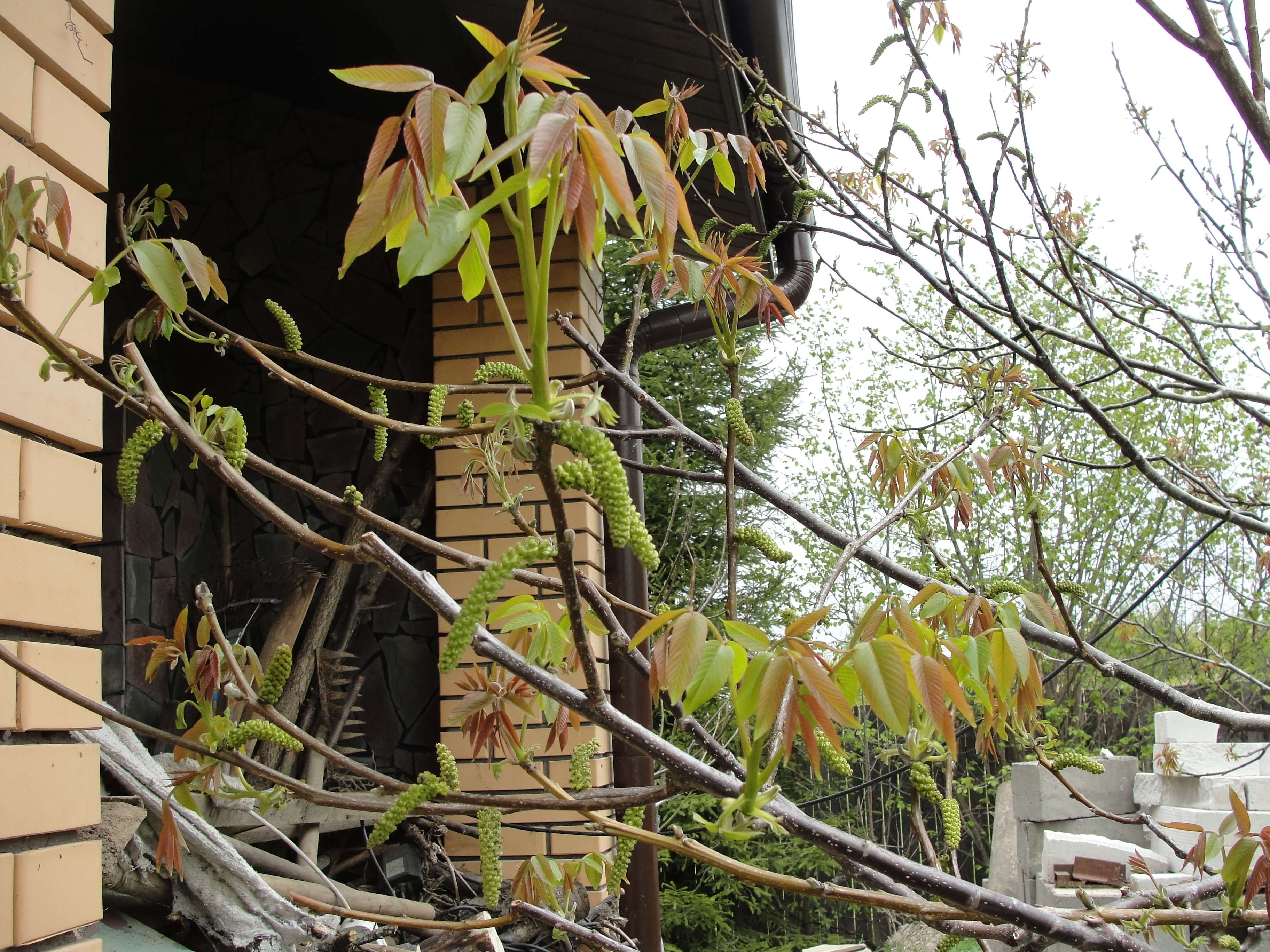 Один из моих орехов заложил первые серёжки на самой макушке. Я только недавно это заметил. Сфотографировал 23 мая.