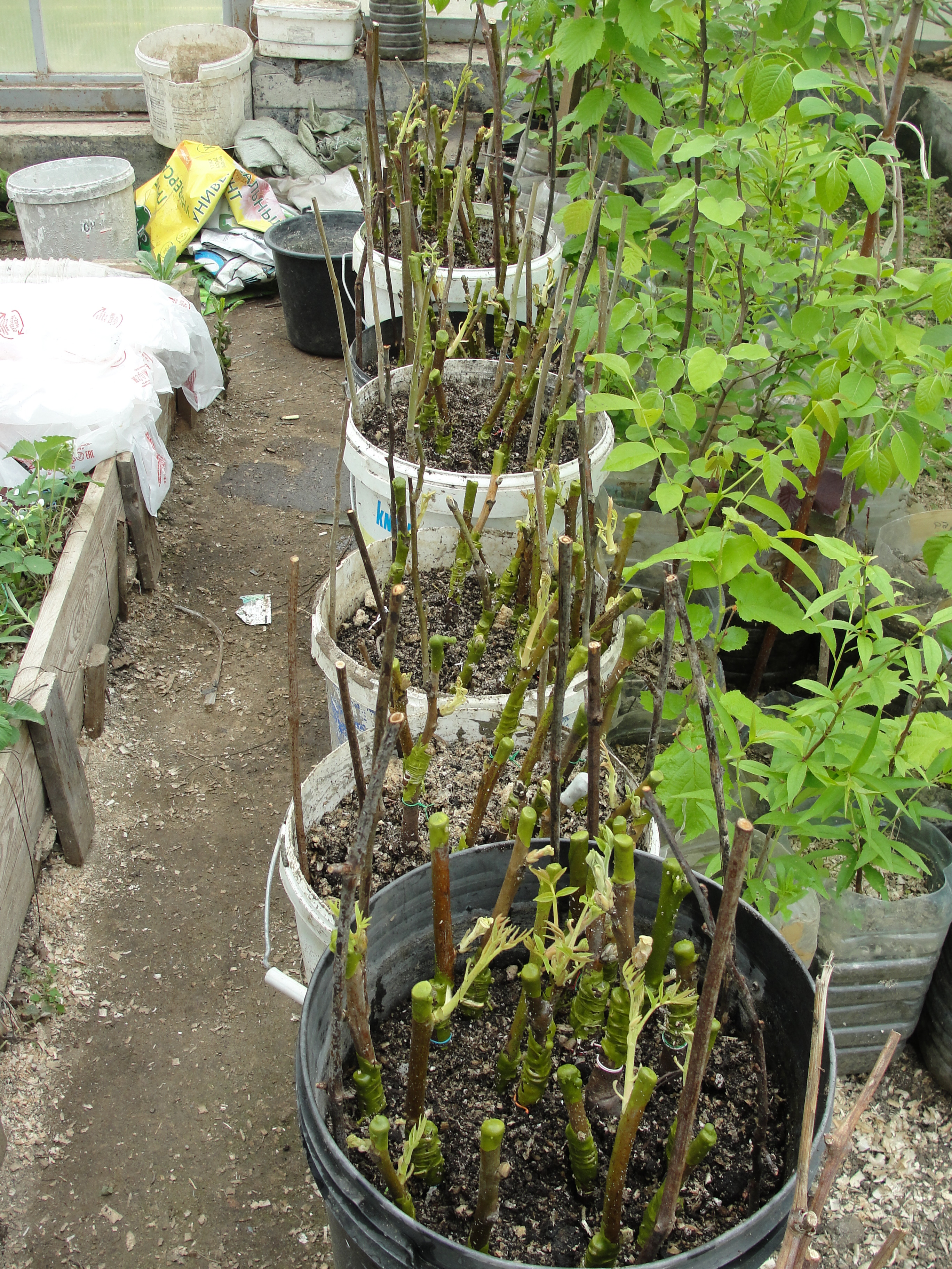 Половина прививок пошли в рост , их в вёдра ( торф с опилками ) штук по 12-16 и под пакеты ( понятно нужны отверстия для вентиляции ),здесь и влажность нужна высокая , но и чтоб не " подпрели ".....