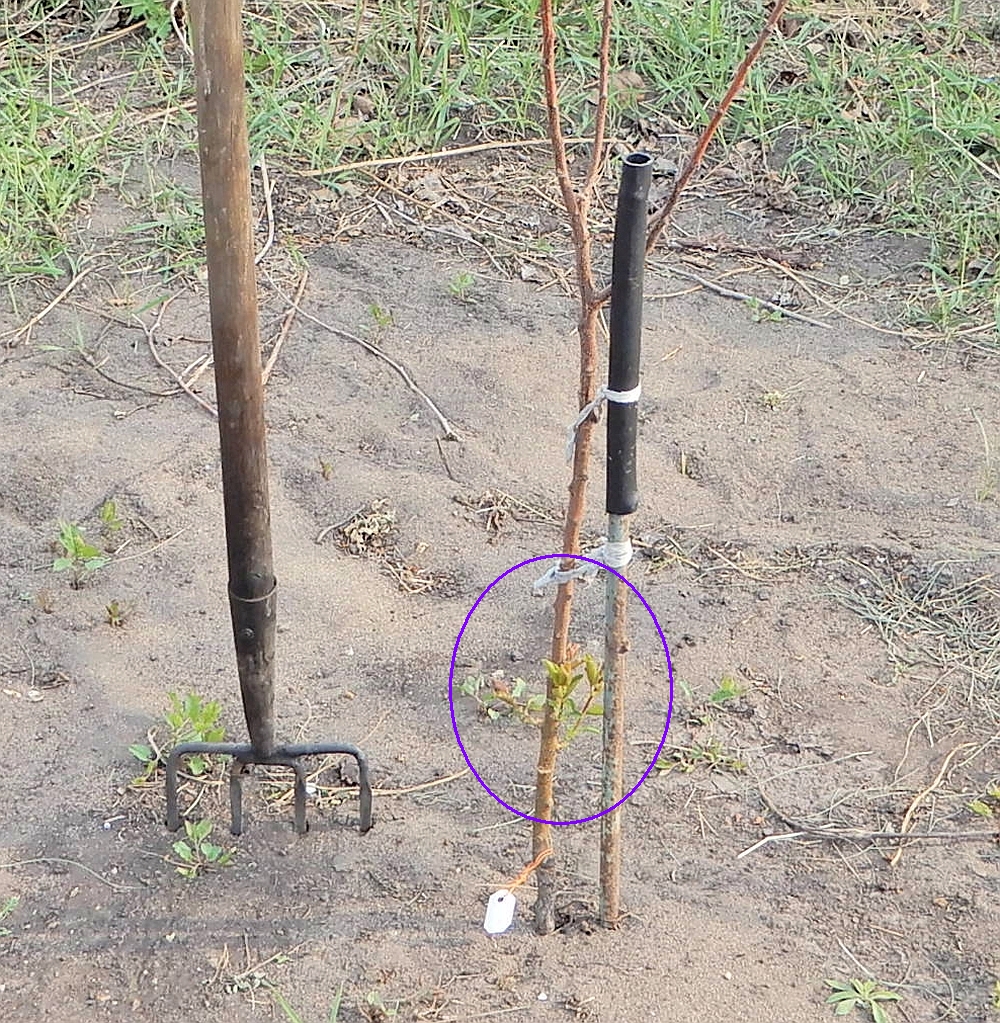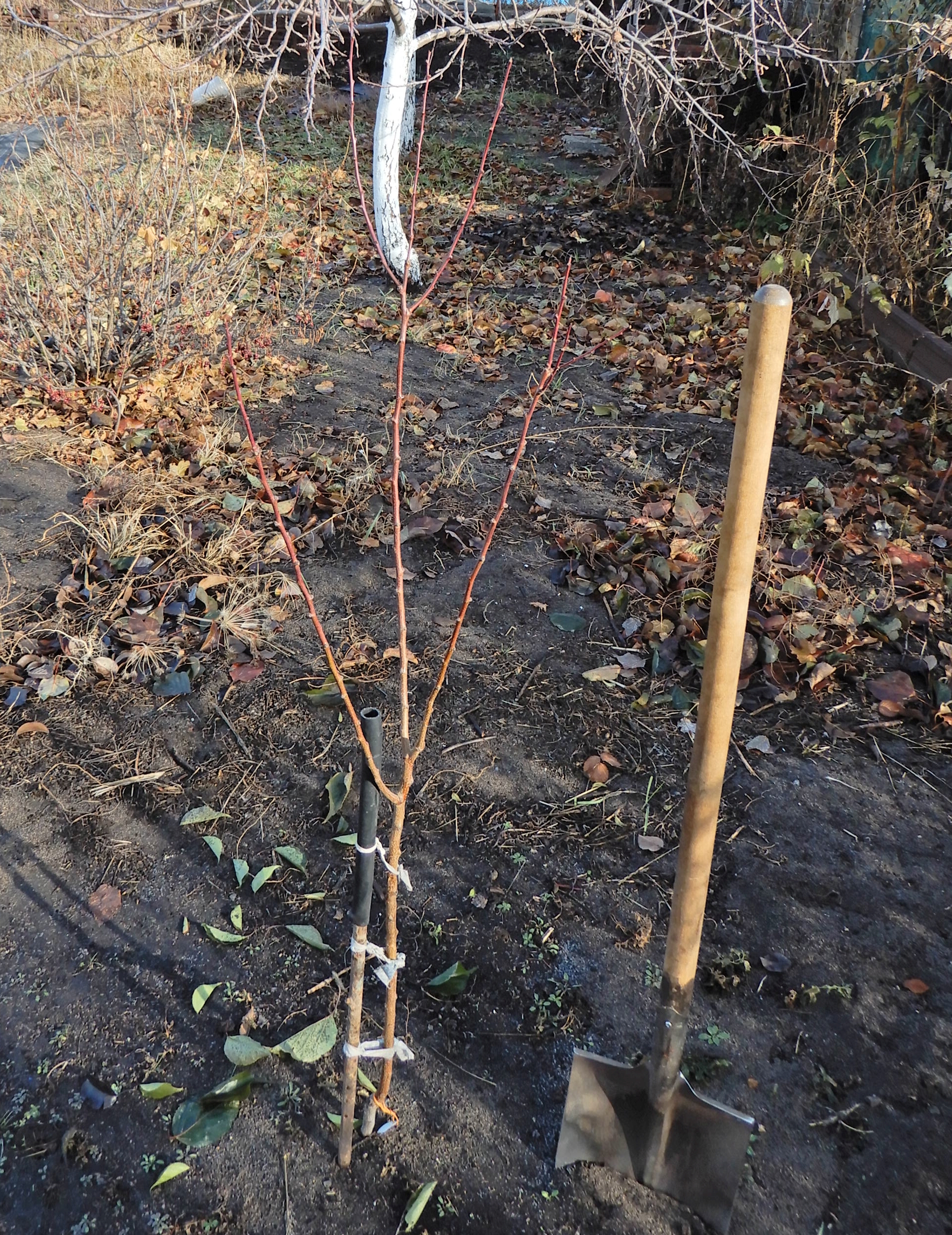 Вот так выглядят сейчас. Дальний - Триумф северный с остатками кольев от укрытия. Все убирать не стал, оставил поддержку ствола, чтобы не делать растяжки. Ближний - Хабаровский с тем, что успел отрастить из спящей почки.