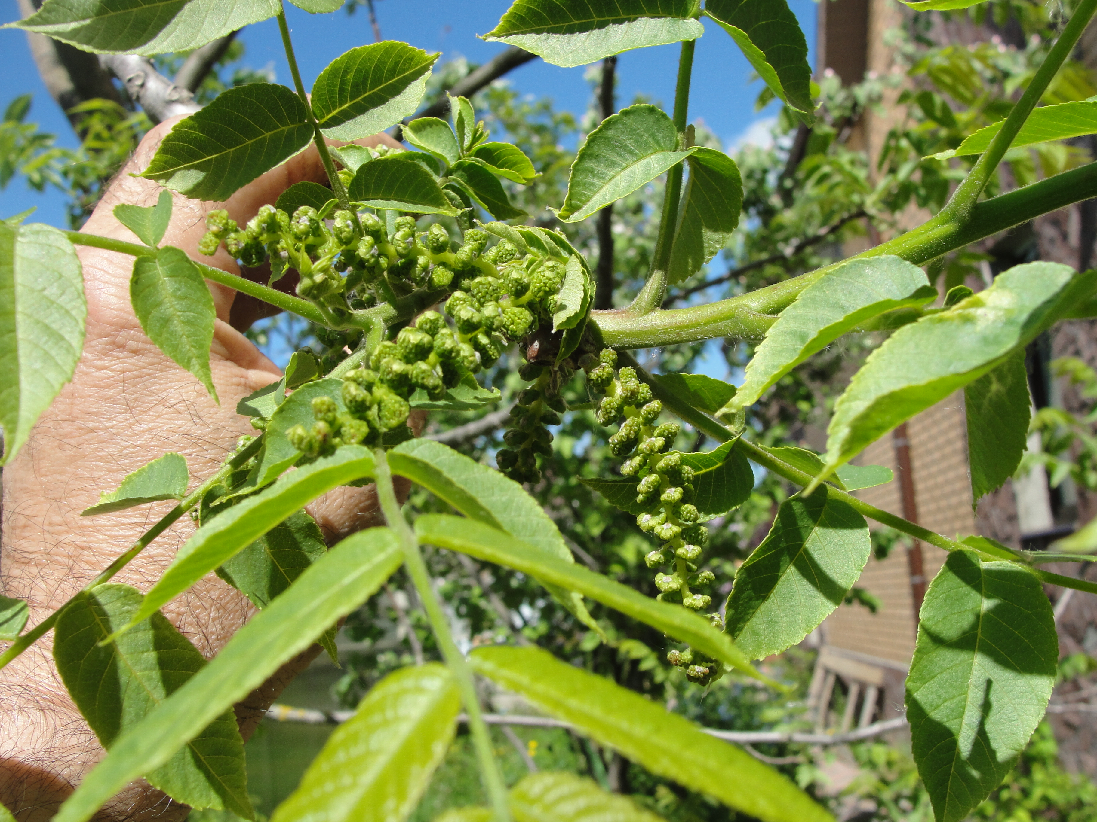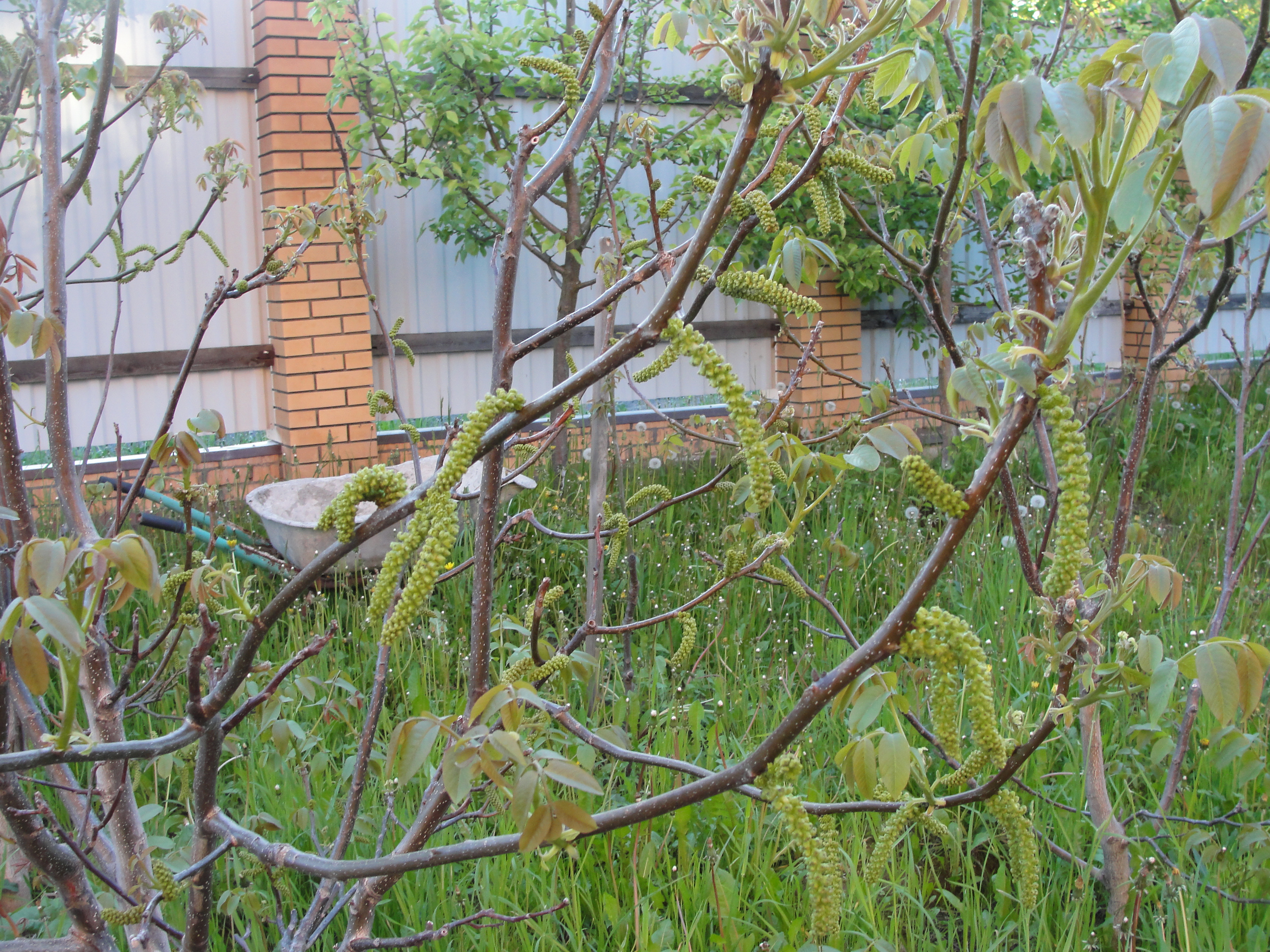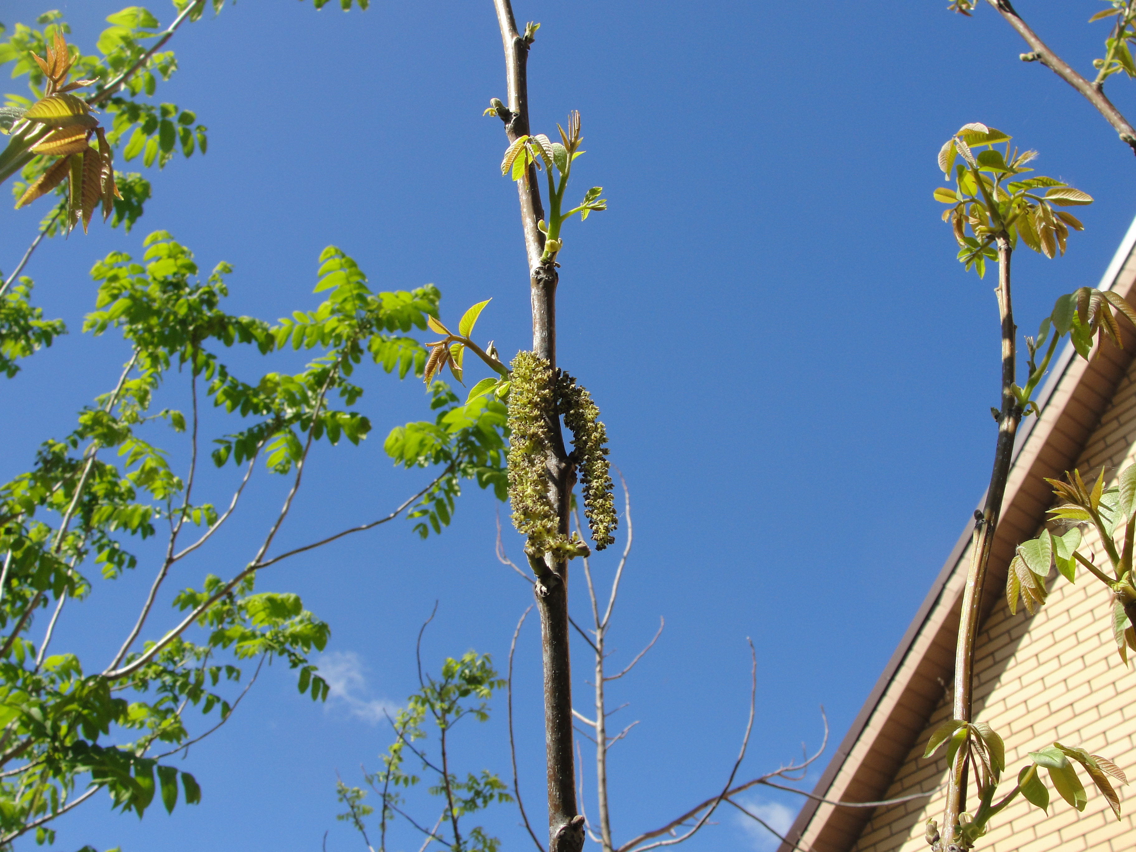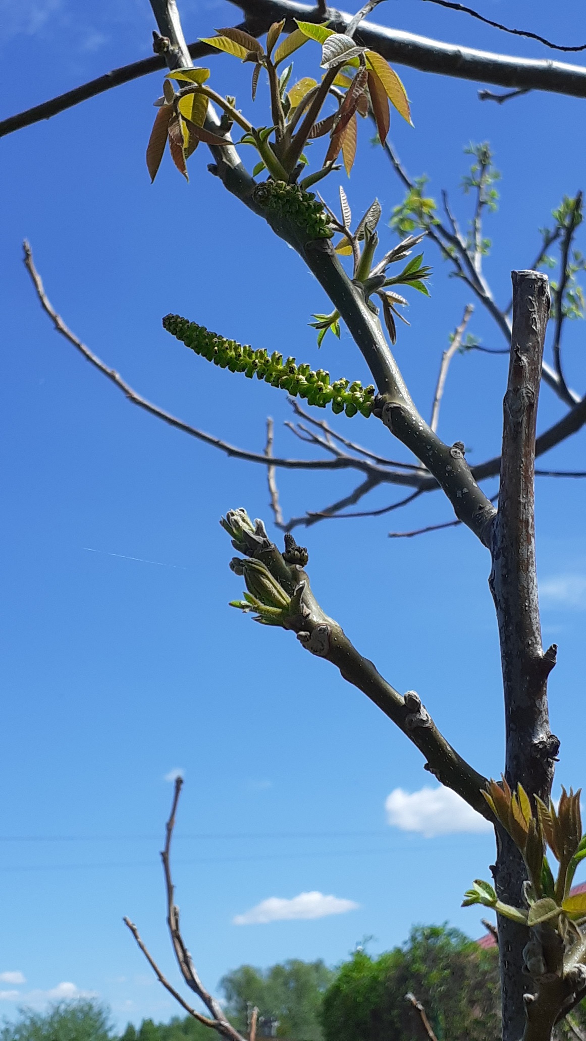 Один из моих орехов заложил первые серёжки на самой макушке. Я только недавно это заметил. Сфотографировал 23 мая.