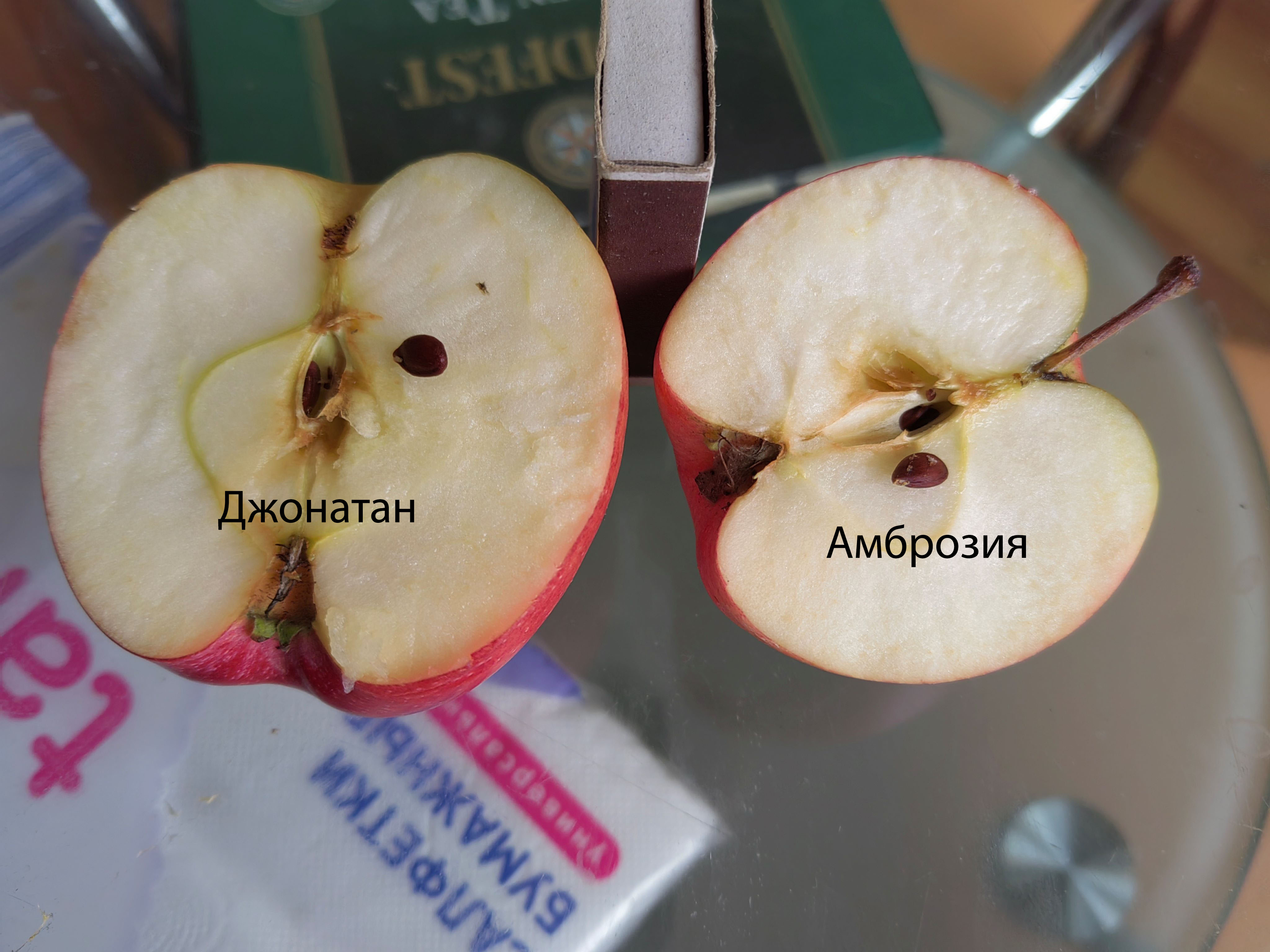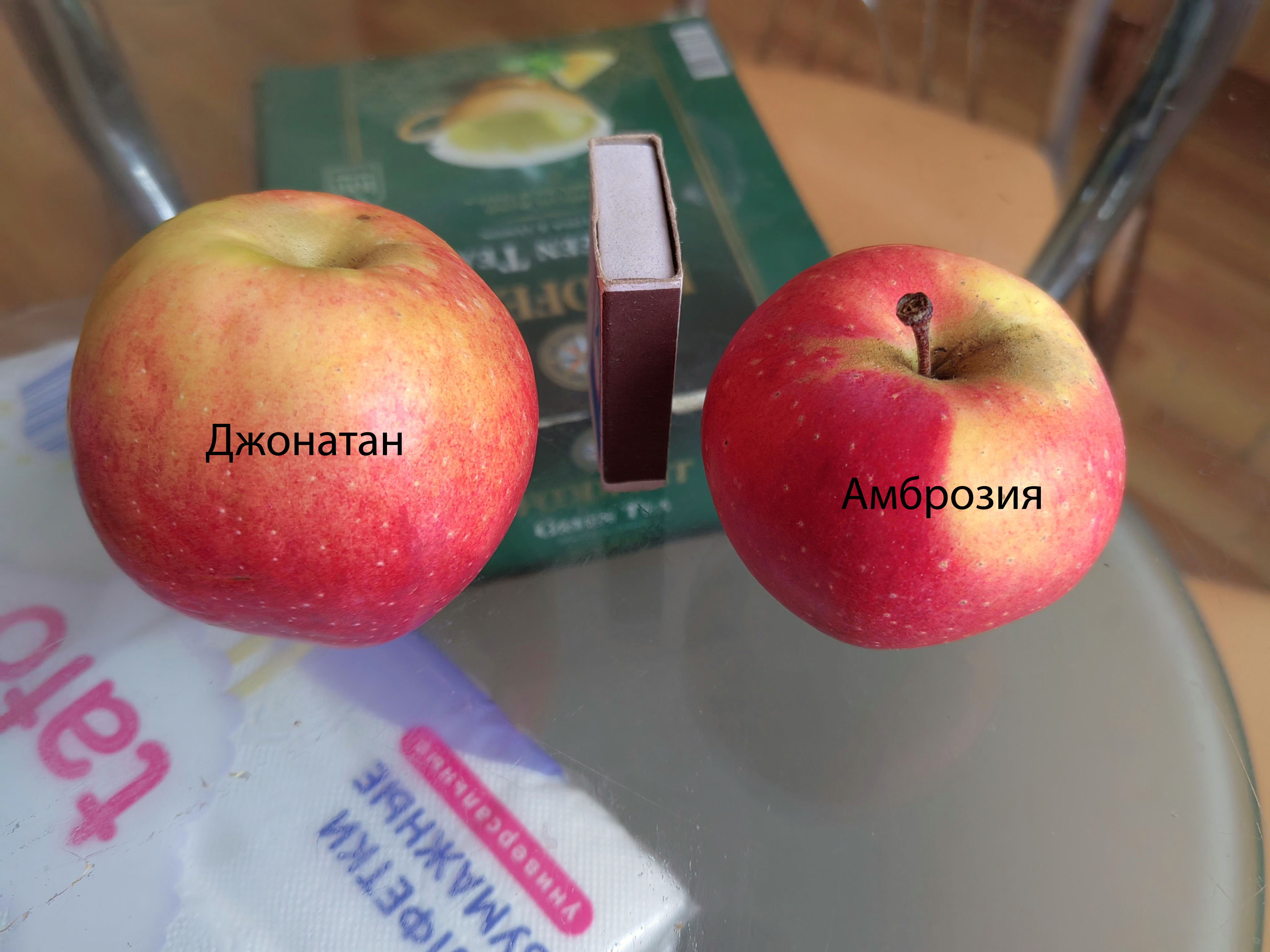 Джонатан, средней плотности,сочный,кисло-сладкий 13бр., Амброзия твердая ,хрустящая мякоть, сочный,сладкий 15бр.Оба яблока очень хорошего вкуса,наверно Амброзия вкусней из за хрустящей мякоти и повышенного сахара.