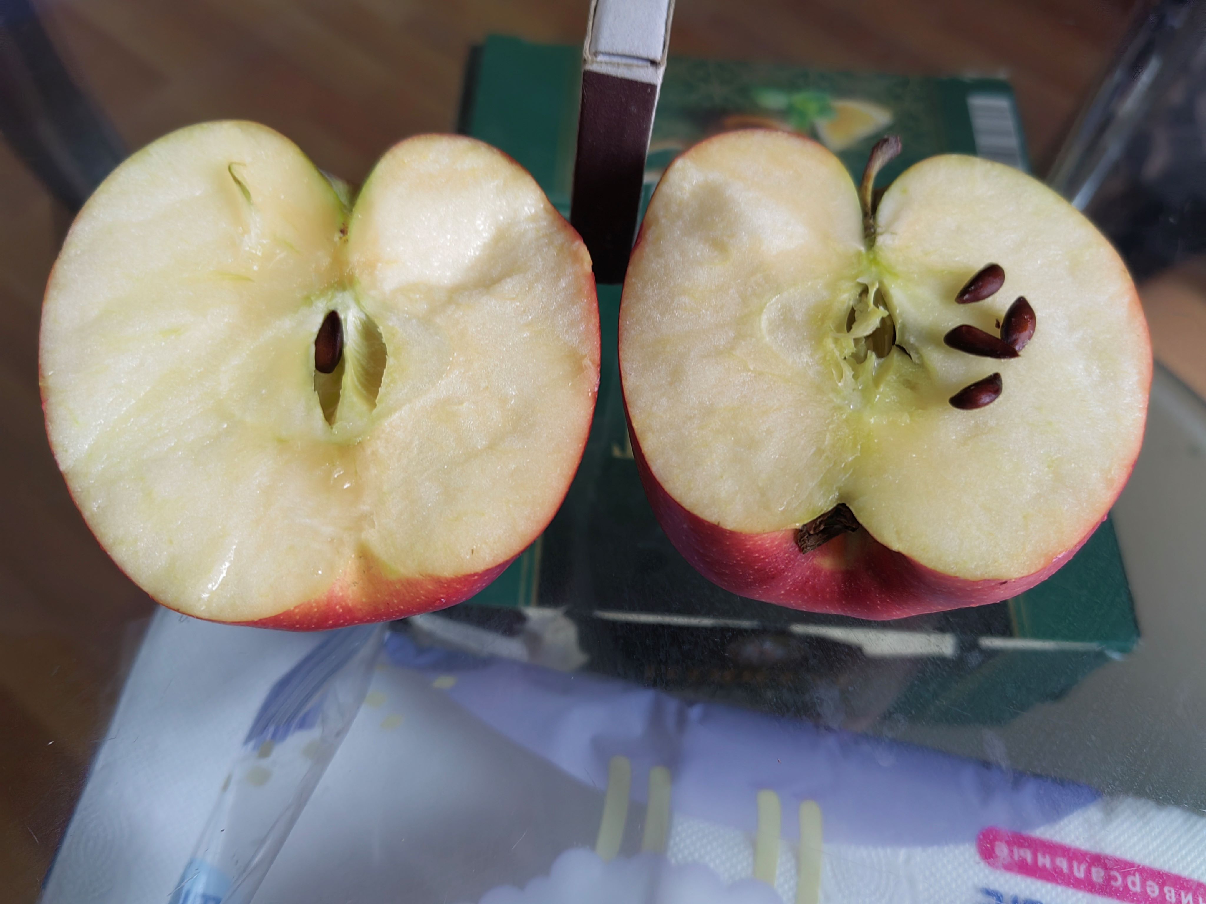 Впечатление - красивое яблоко, на вид как-будто отлито из пластика и раскрашено. Вкус мякоть твёрдая, но очень сладкая, я кислоты вообще не почувствовал. Дам полежать в тепле, может станет помягче и посочнее, чтобы не травмировать десны.