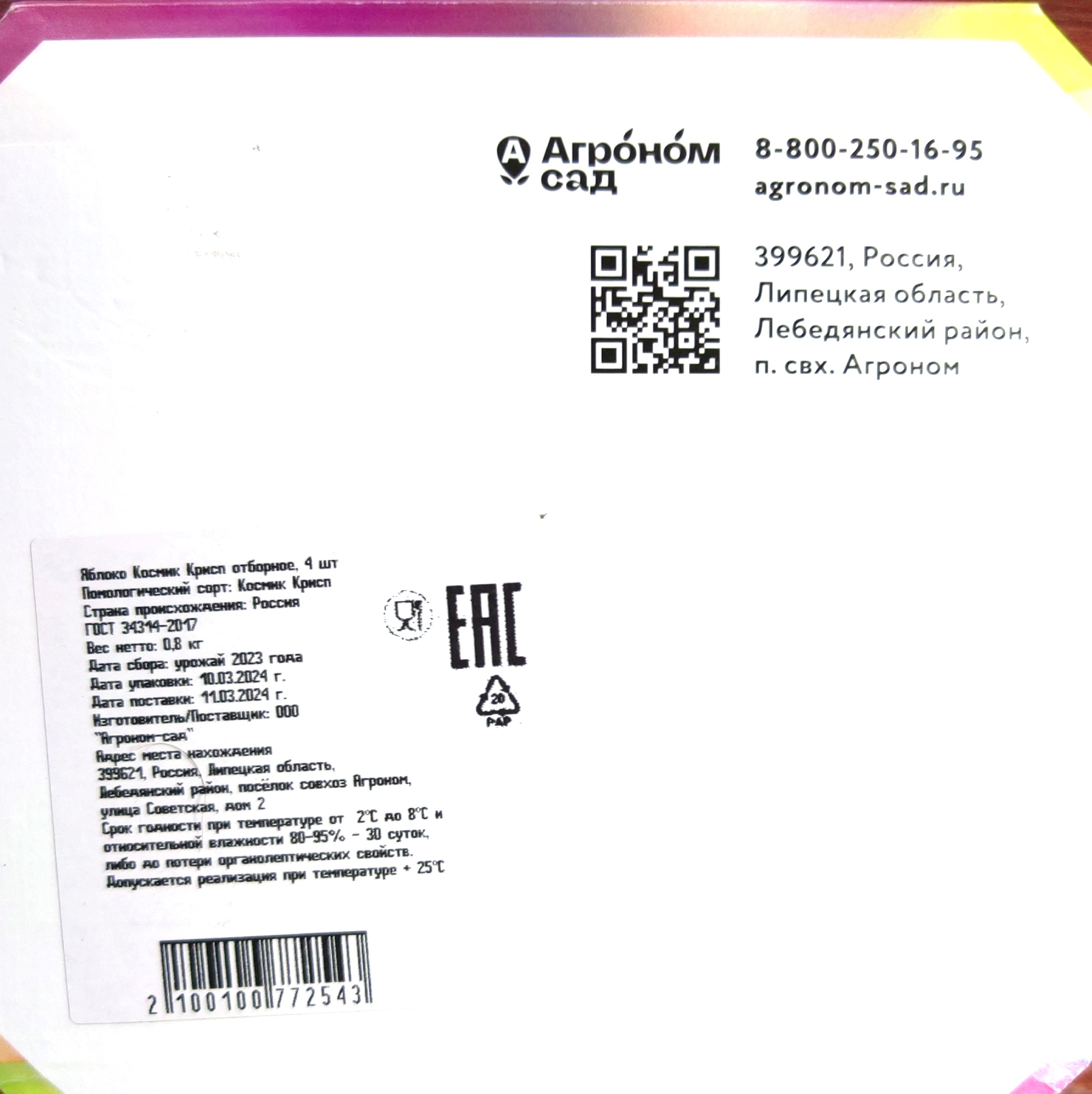 Зимостойкость Космик Криспа в условиях средней полосы никто ещё не проверял. Он растёт в садах Агроном сада, а это Липецкая область. В Мичуринске его только начали проверять. Севернее его никто не проверял. Лежкость плодов у него уникальная, в Мичуринске в институте проверяли его лежкость в хранилище, на июль месяц он был как с ветки и вкус не потерял и качество мякоти и сочность на высоте.