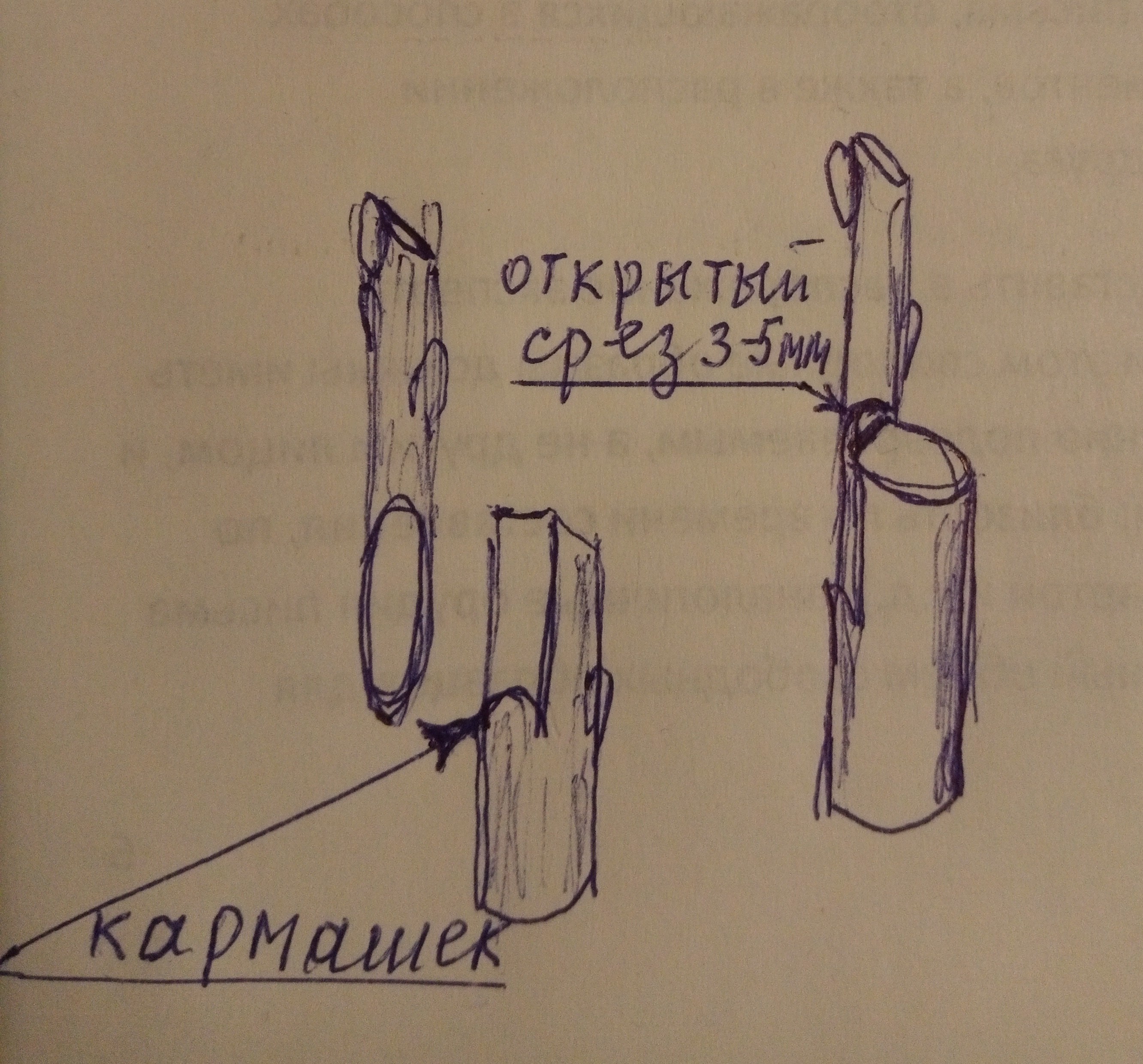 Бывает не совсем с руки сделать зарез-язычок, тогда делаю внизу среза на подвое "кармашек", как при окулировке вприклад. И обязательно оставляю сверху 3-5 мм косого среза на черенке-привое. Срезы замазываю после снятия обмотки с прививки.
