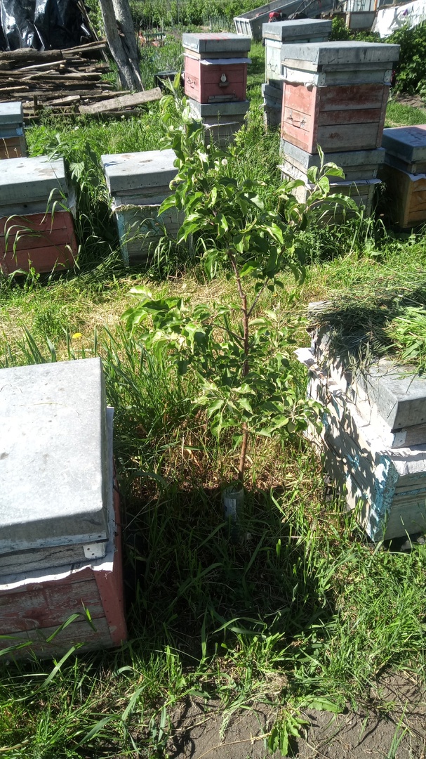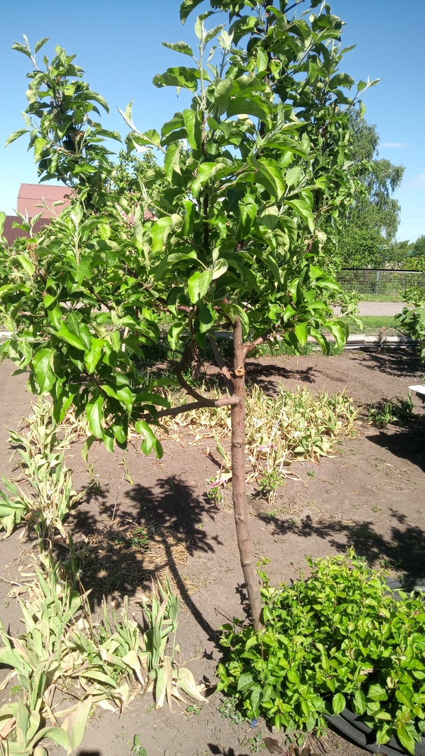 На этом дереве на момент съемки - основа Мелба, привиты Первинка слева, Редфри спереди, Коваленковское справа, сзади Орлик и колонна ноунейм. Сейчас еще добавлено - Беркутовское, и 5 прививок от сеянцев колонны.