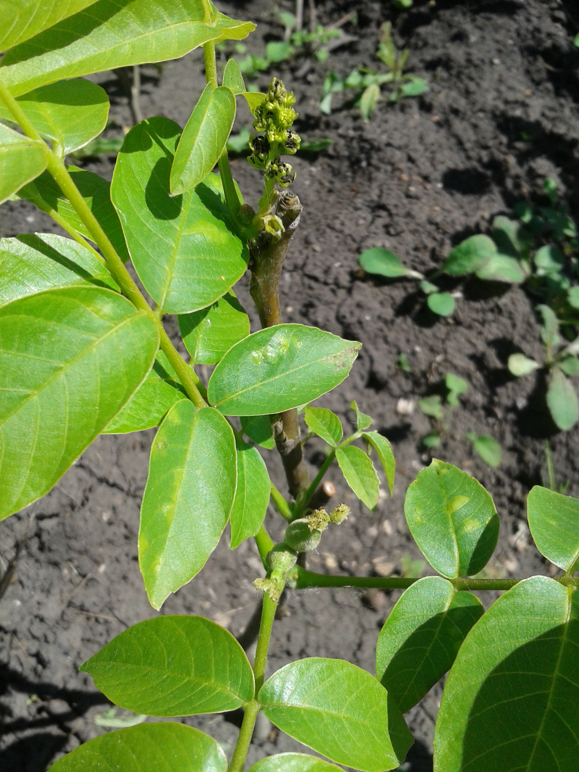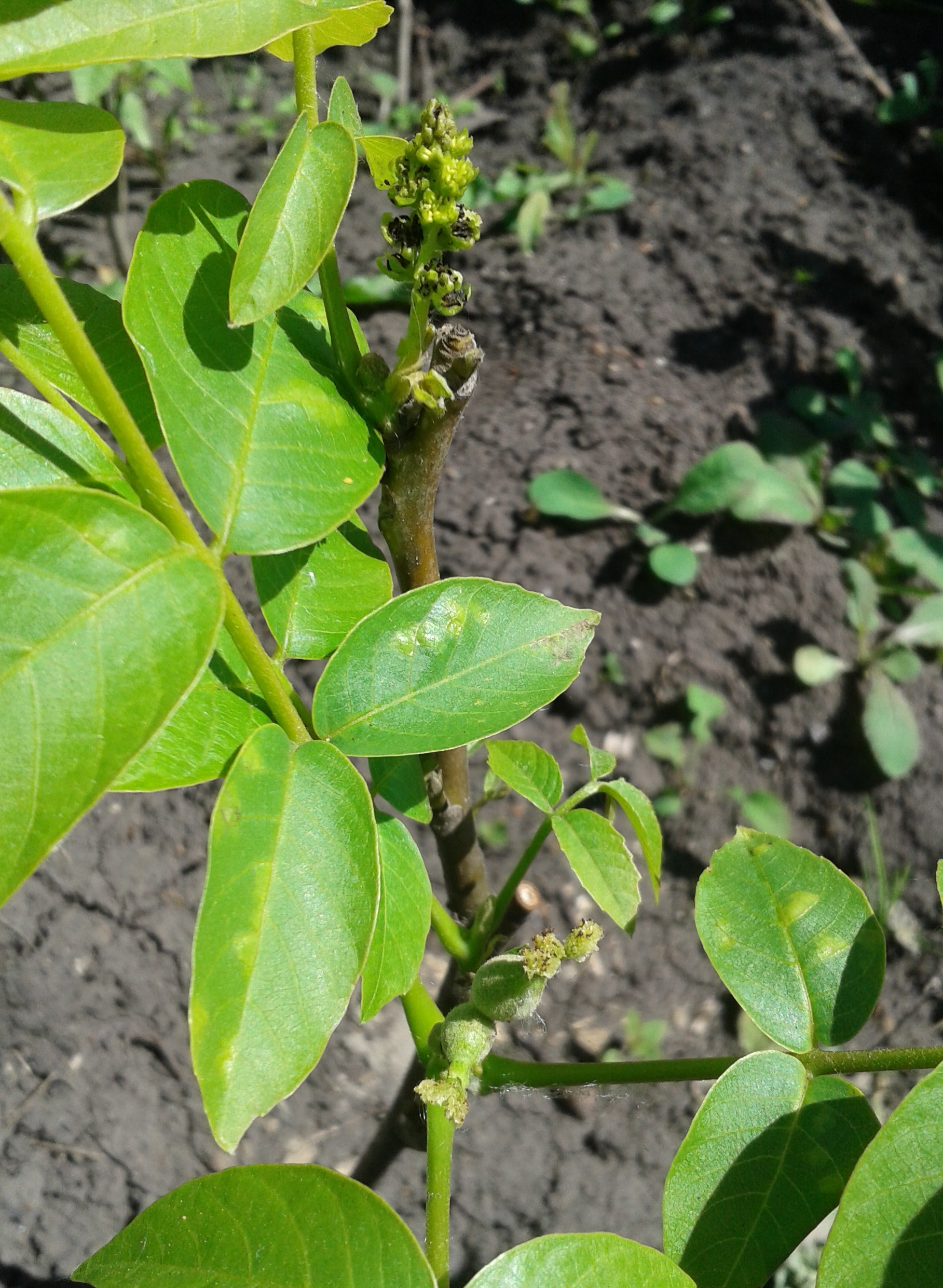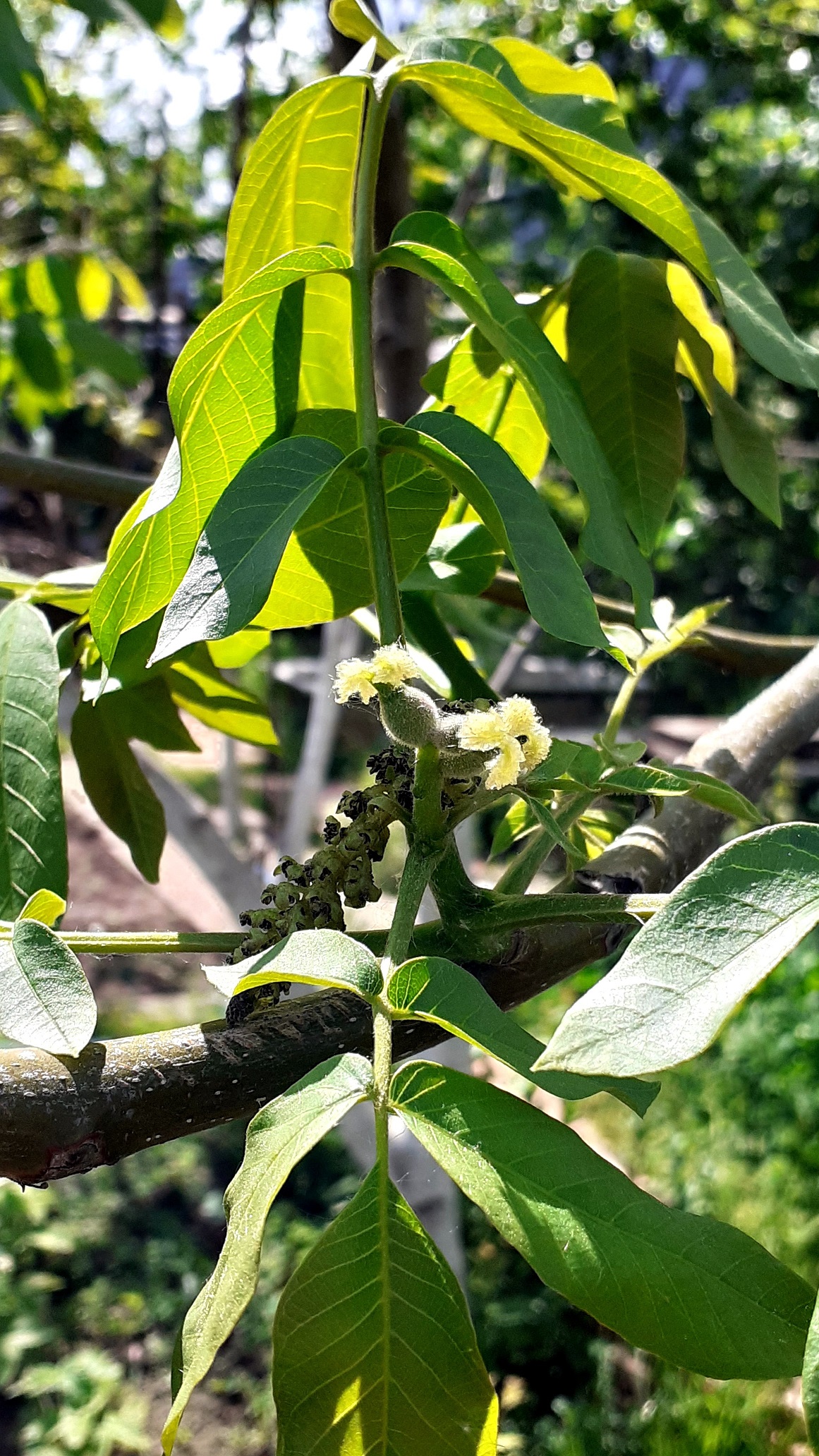 . Цветение грецкого ореха (сверху серёжка, снизу - женские цветки). Фото от 13.06.2022 г.