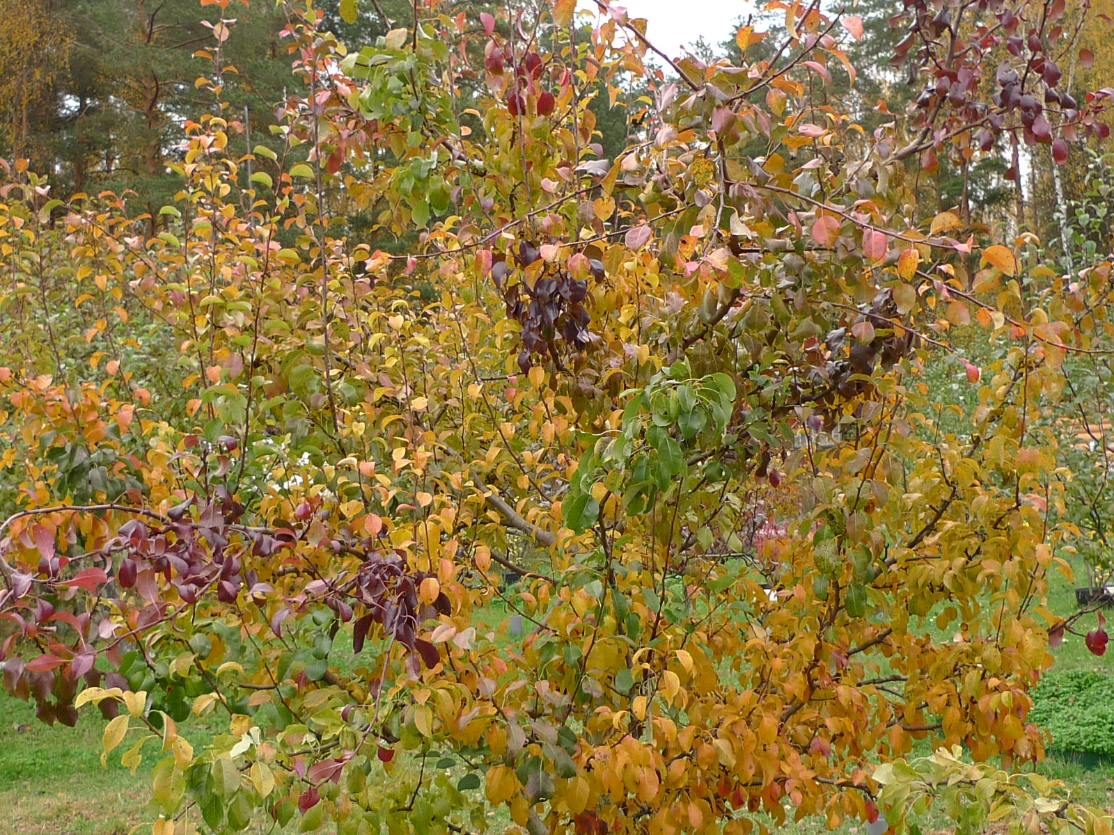 От "особенностей" багрянец появляется. У клёна, бересклета, амурского винограда - от антоциана в клеточном соке. У груш, особенно, у видовых - от большого содержания в листьях других - не зелёных пигментов. Когда не хватает солнышка(плюс другие условия) хлорофилл уже не образуется, поэтому становятся заметны пигменты других цветов.