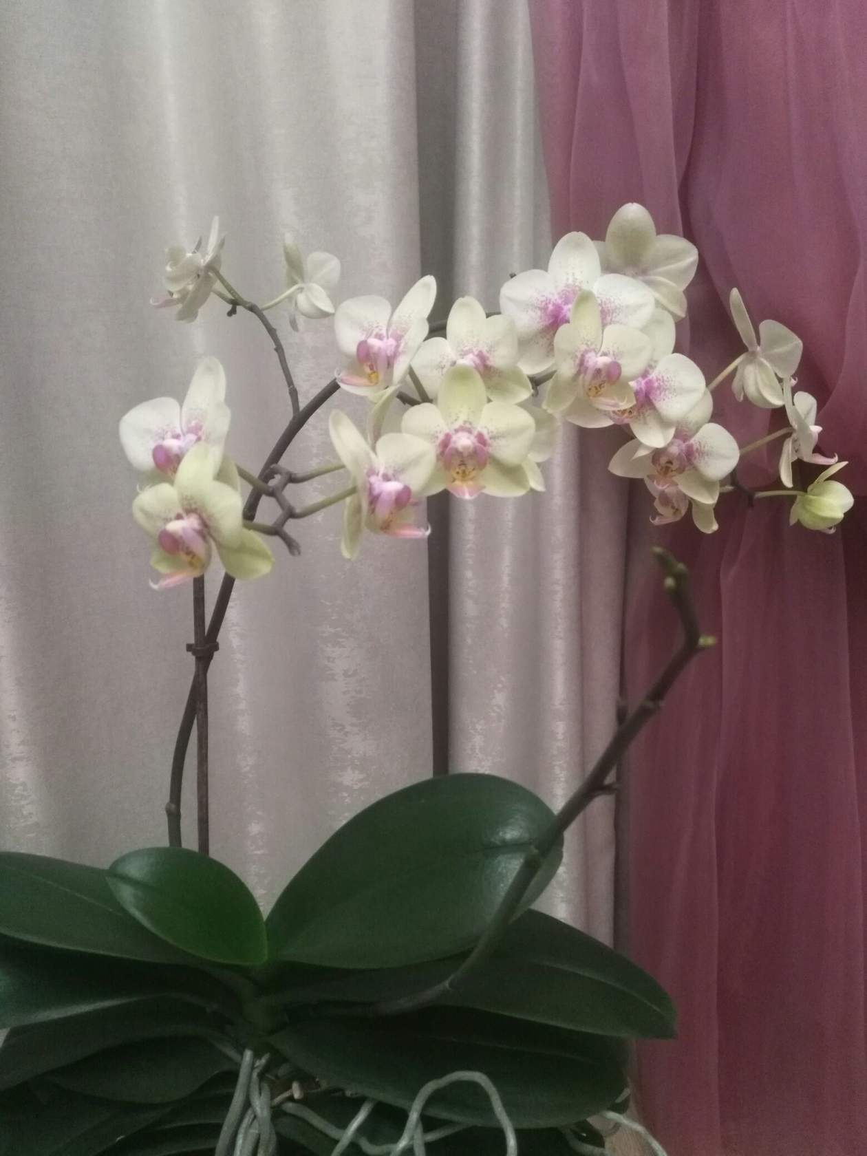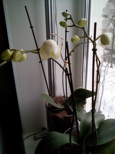 Вот эта орхидея дорастила свой корень в колбе до уровня воды - листья в тургоре, два старых цветоноса все в новых бутонах (я не срезала цветоносы после того, как она отцвела после покупки)