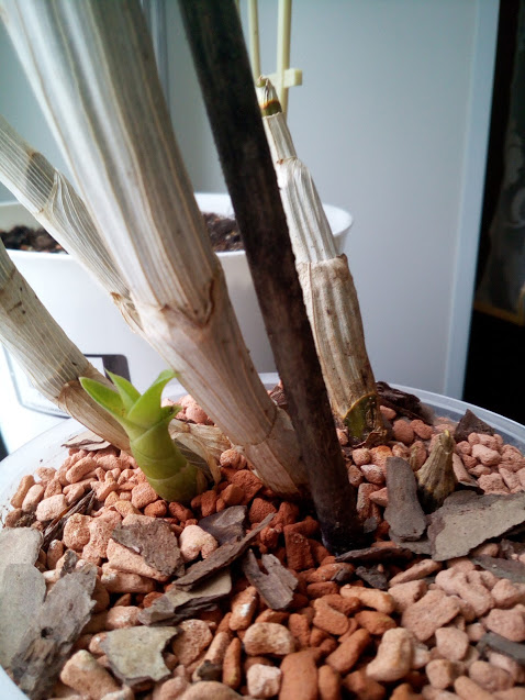 С дендробиумом я ошиблась, когда посадила его в колбу. Ему такой способ не подходит. Хорошо, что я вовремя спохватилась и пересадила его в смесь коры и серамиса. И теперь у него появился новый росток