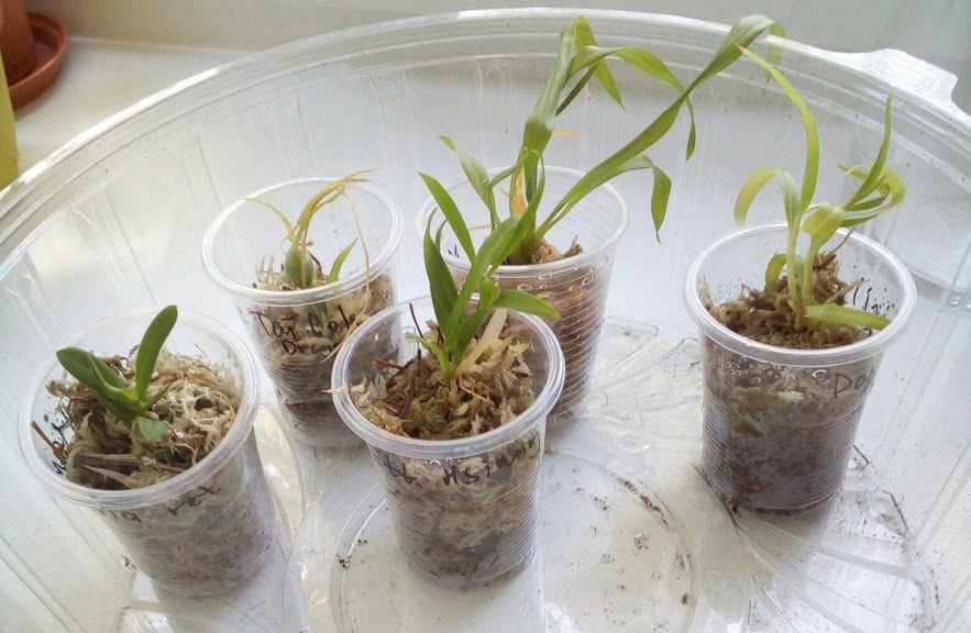 в мае прошлого года купила 5 сеянцев разных орхидей из фласки. Вот так они тогда выглядели