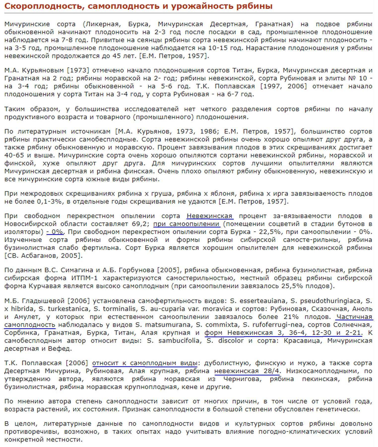 По литературным источникам [М.А. Курьянов, 1973, 1986; Е.М. Петров, 1957], большинство сортов рябины практически самобесплодные. Сорта невежинской рябины очень хорошо опыляют друг друга, а также рябину обыкновенную и моравскую. Процент завязывания плодов в этих скрещиваниях достигает 40-65 и выше.