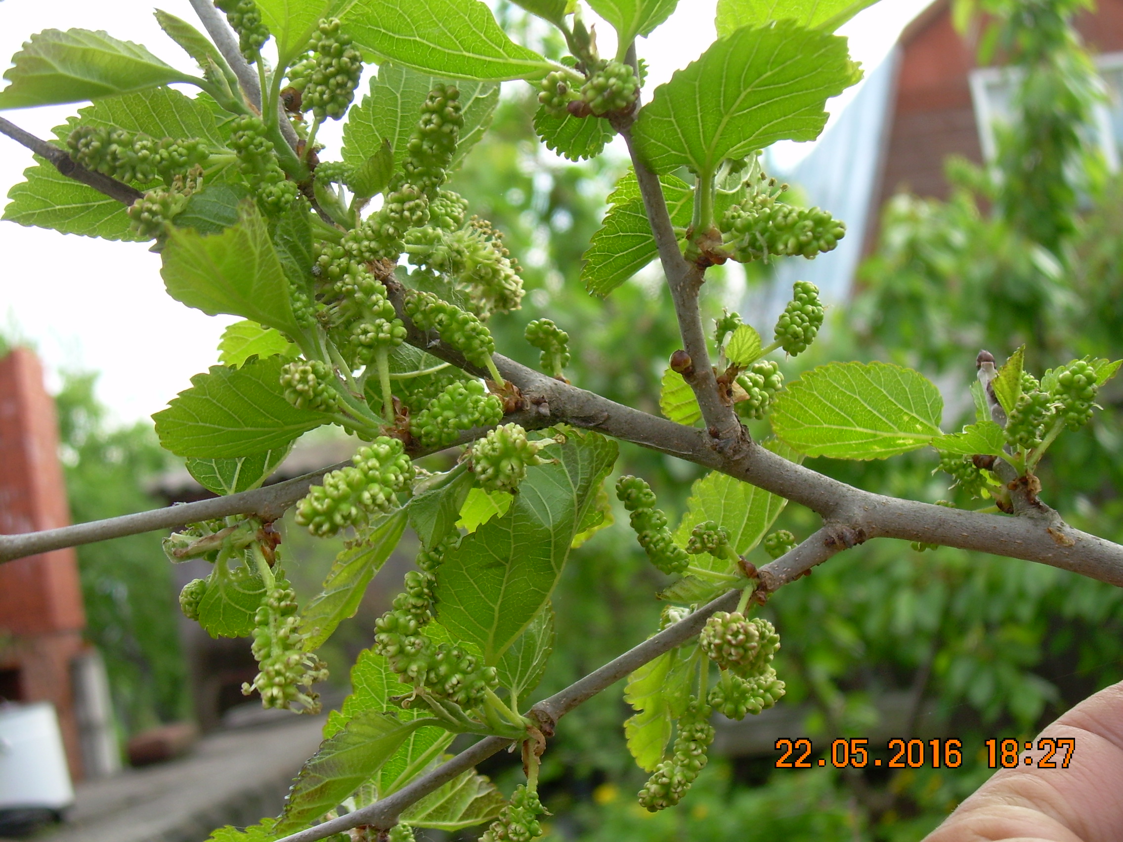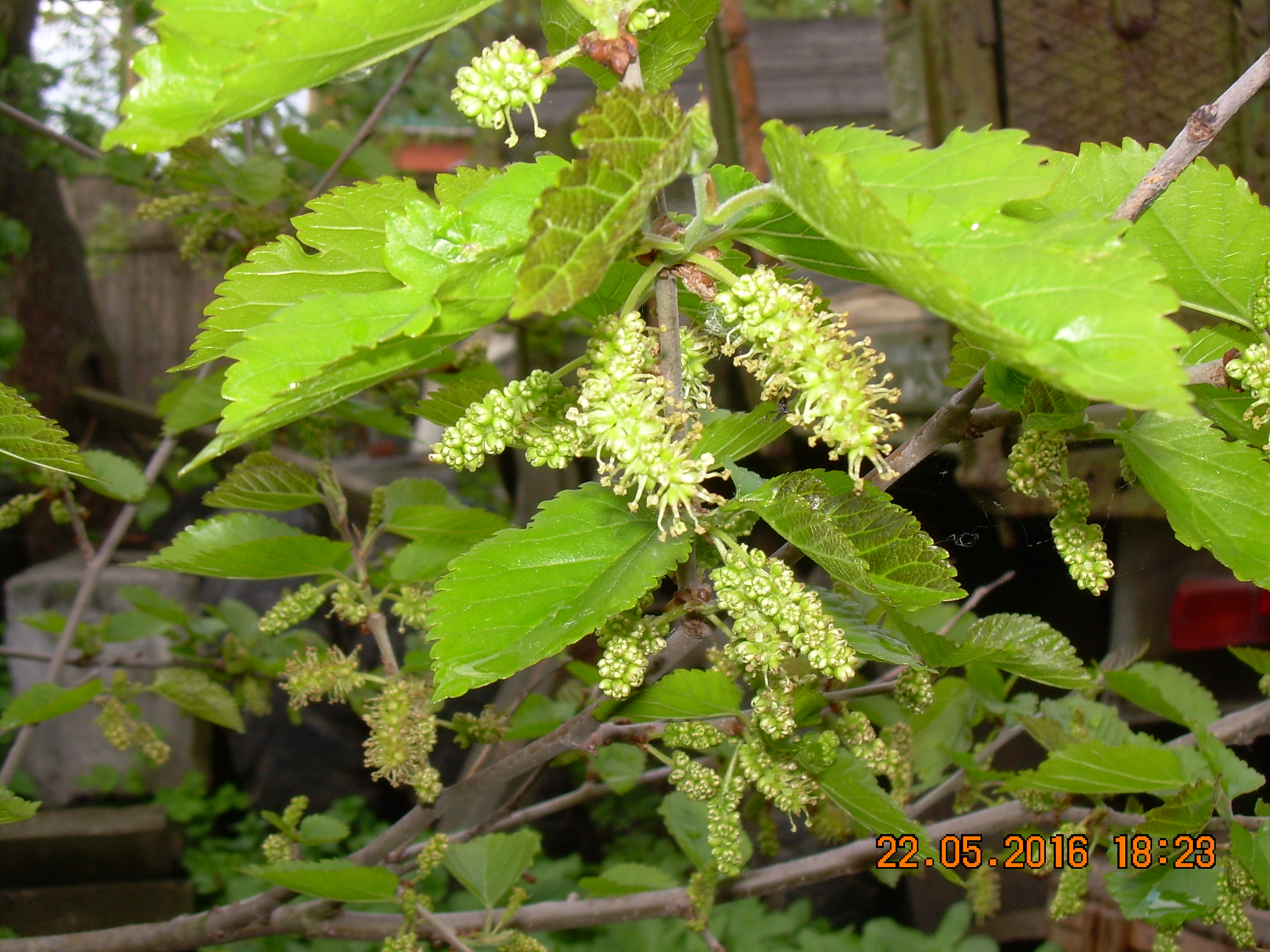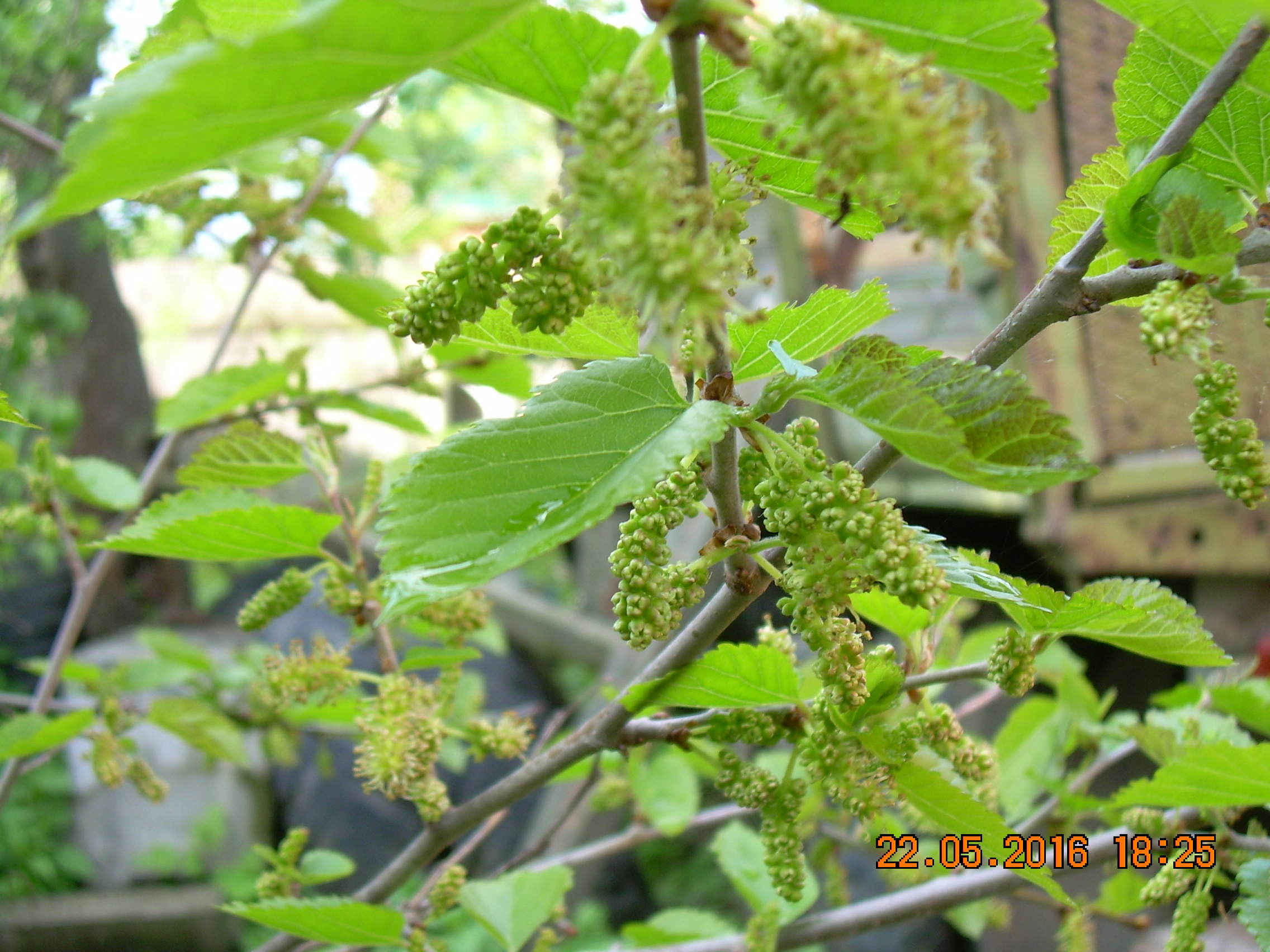Зацветает шелковица, посаженная в 2012. Рассматривал соцветия - есть и мужские и женский. Вот ее фото.