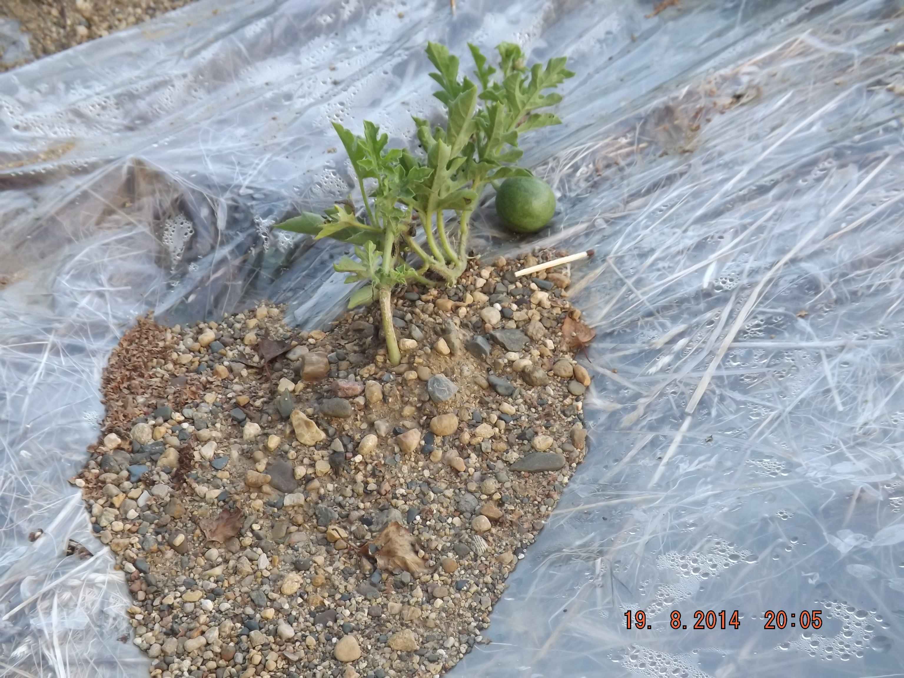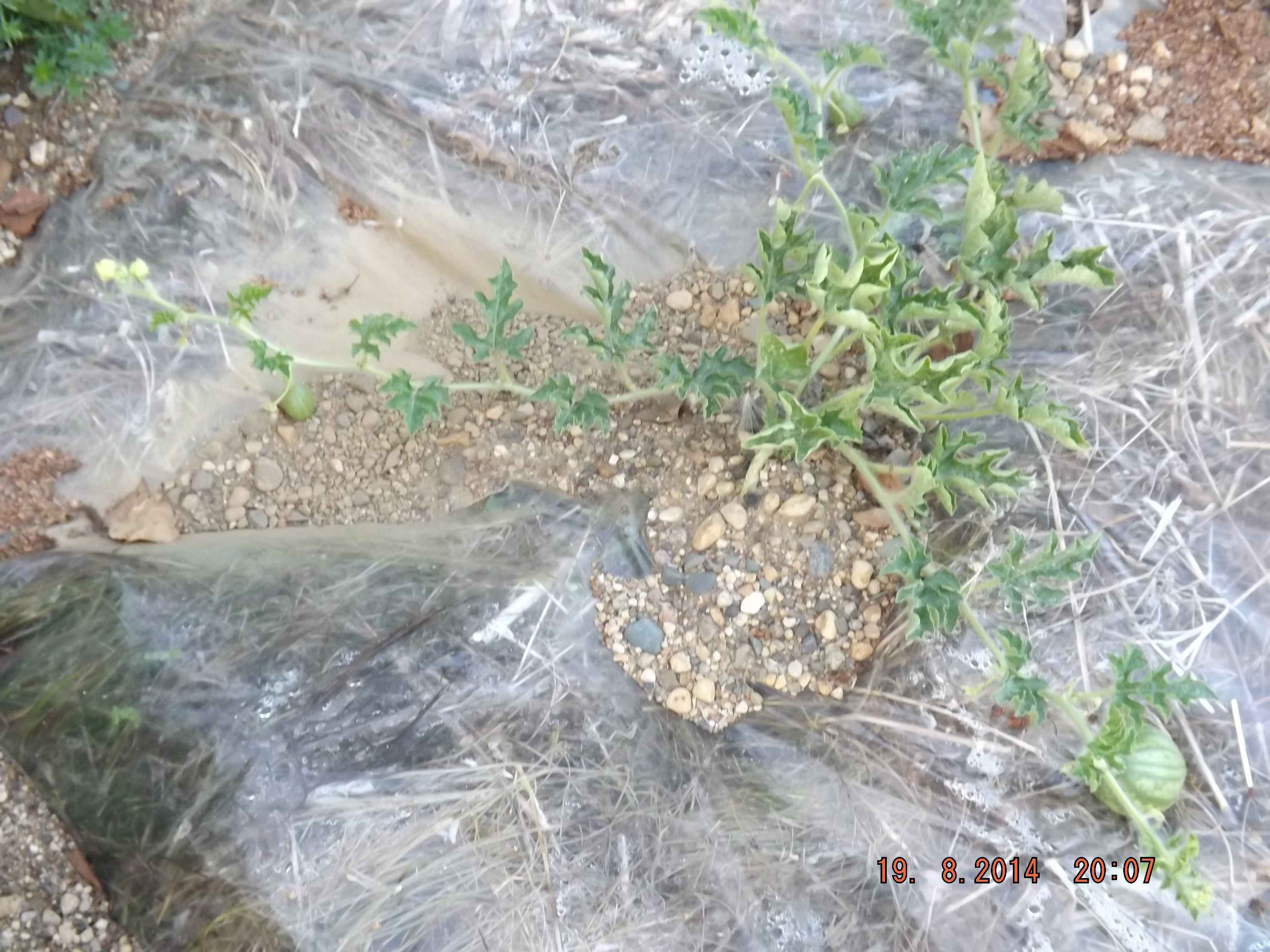 И еще:помните июнь прошлого года с похолоданием ?Я посадил рассаду и прикрыл лутрасилом для акклиматизации.на утро после снятия лутрасила началась не погода,но накрывать уже не было возможности -выпада растений ни арбузов ни дынь не было.Было два не совсем понятных для меня арбуза:ботва практически не выросла,но пытались арбузы вызреть---но там такой момент рядом растут березы и хоть прямой тени нет но все возможно.?.Для масштаба спичку положил.