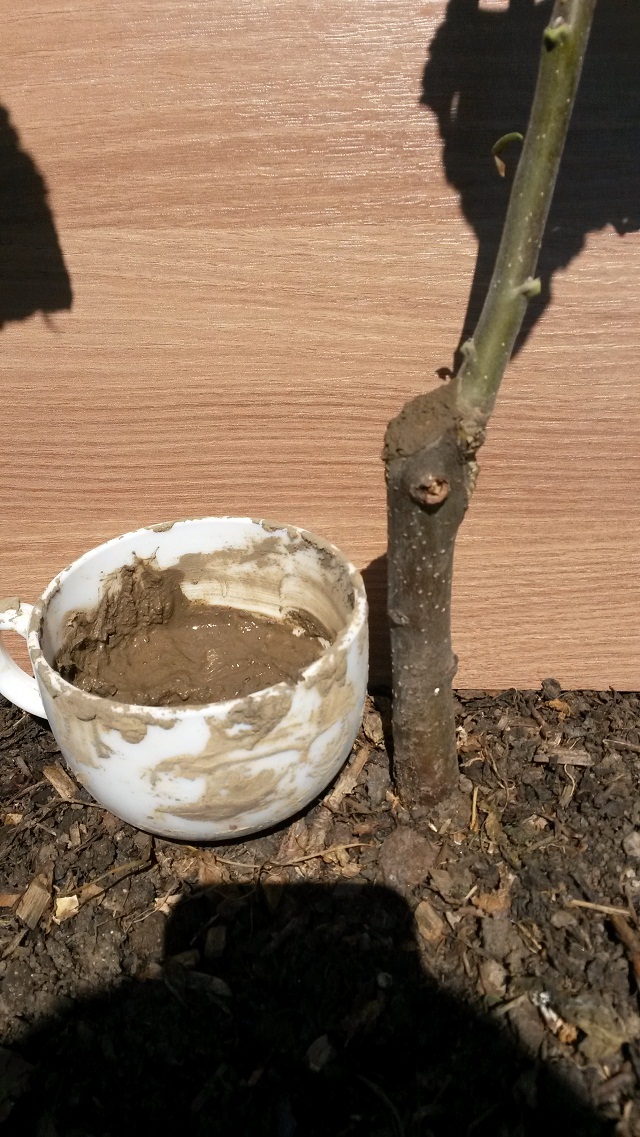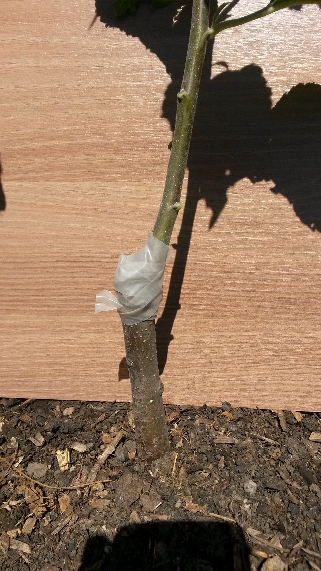 Обновил срезы прививочным ножом(садовым не очень владею), до живого места, смазал глиной и обмотал плёнкой. Без пореза пальцев, конечно не обошлось. Ругал себя за то, что при покупке секатора пожадничал. При обрезке подвоев, был бы секатор получше, может не случилось бы этого-?