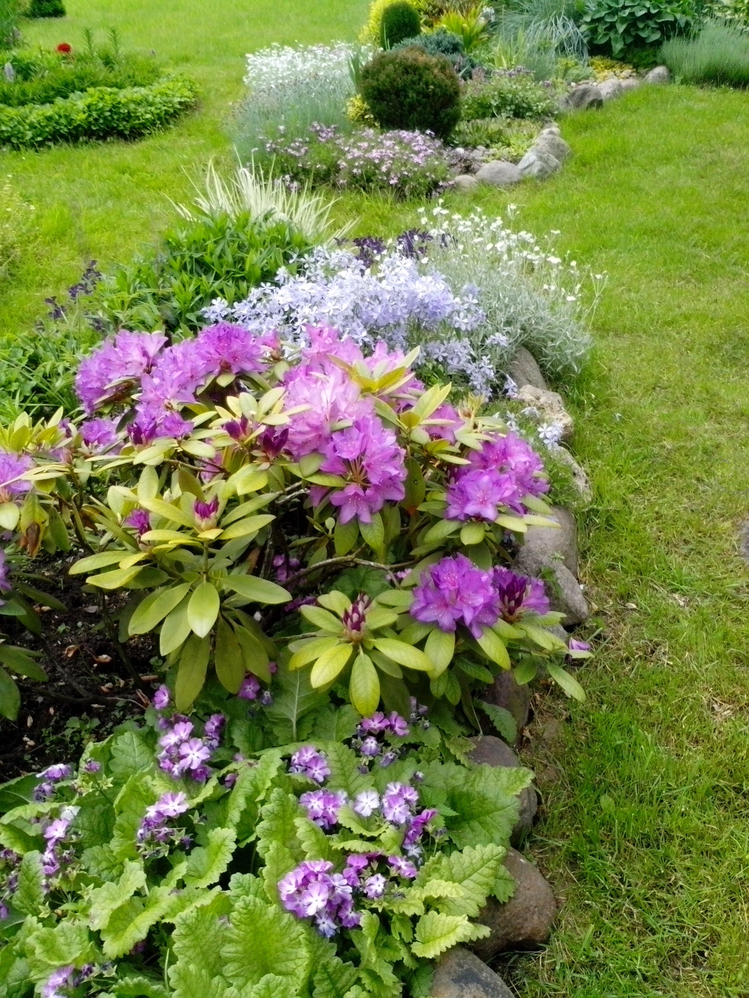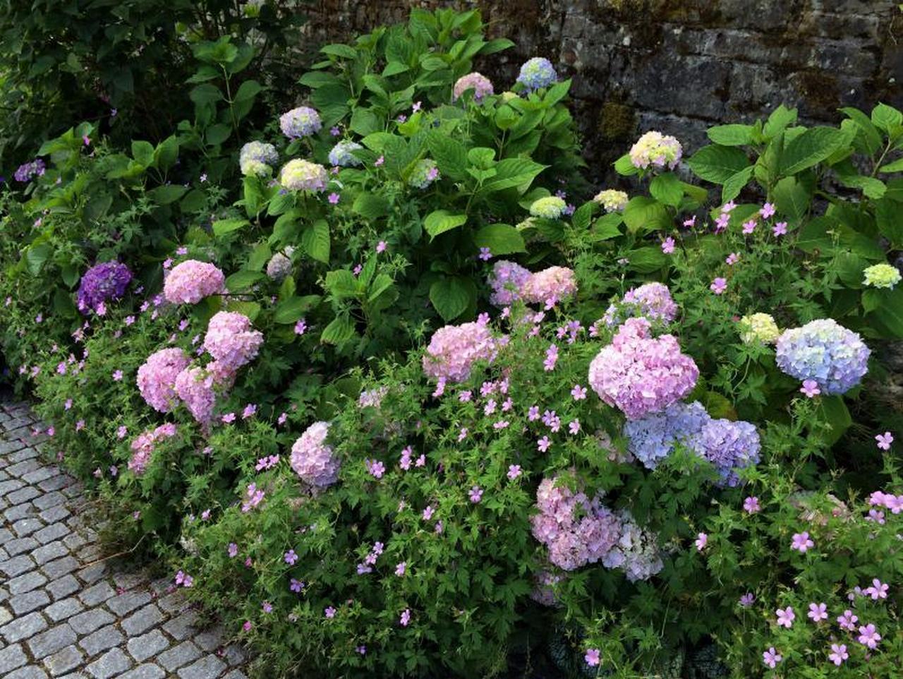 Я в цветах - не очень, но это, кажется, Гортензия крупнолистная "Букет(то ли Роз, то ли Рози)", а она красавица, если реакция почвы кислая и насыпано сульфата алюминия огромное количество. А как же герань то, интересно? Значит, мирится с такими условиями... Но, вообще то, герань будет цвести всего месяц, а Букет роз - до сентября. Может, дельфиниум тогда брать? А, вообще, прям, по Литрис Айсмен : 6-ть частей площади занято тёмно-серым цветом, 5-ть - светло-серым, 4-е - пурпурно-фиолетовым. 3-и - фиолетово-синим,2-е светло-синим, одна - зелёным(я имею в виду пик цветения). Эта дизайнер очень в Англии модна и знаменита. И любит сочетания так составлять(по площади): 6:5 :4 :3 :2 :1. В её альбоме в основном такая пропорция. Там даны уже готовые сочетания. В них - "по науке" цветовой баланс.