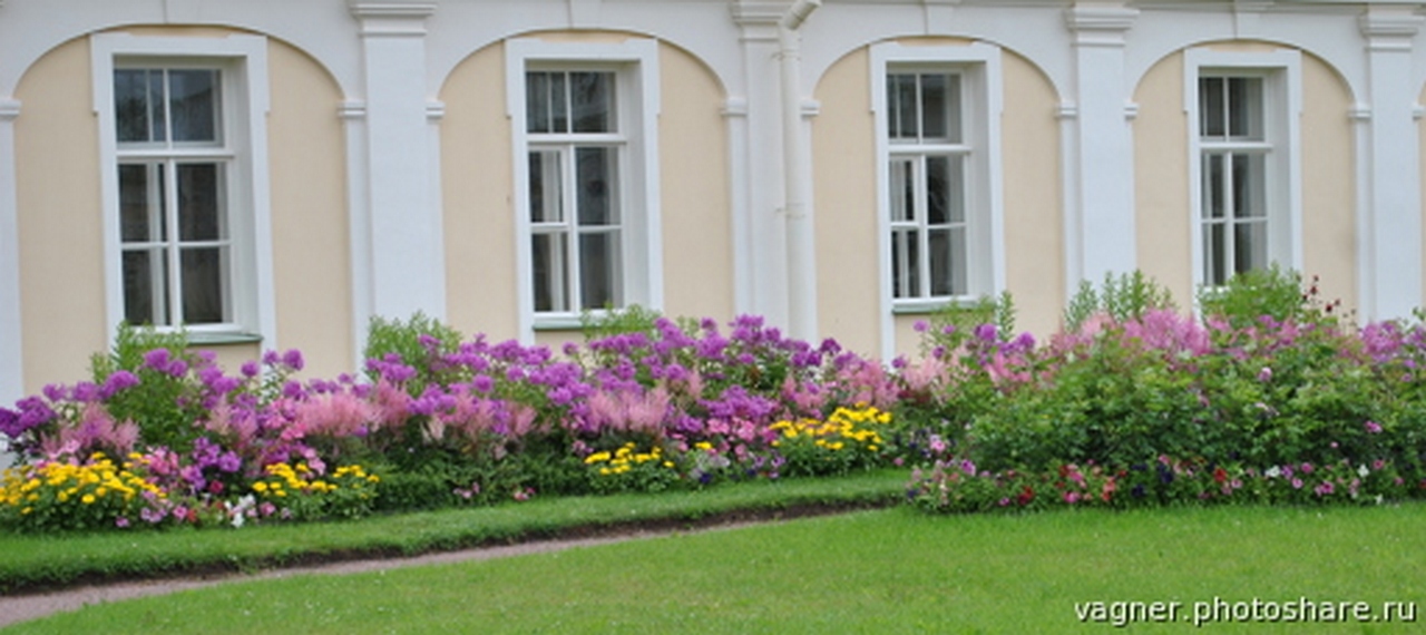 В цветниках около дома поменьше контрастности. Лучше гармония "по сходству". Например, от калитки к дому две(правда, "сезонные") рабатки - сочетания оранжевого и жёлтого(сорта примул и тагетеса) с белыми сортами. Это если дом невысокий, а высокий - не цветники уже, и миксбордеры.