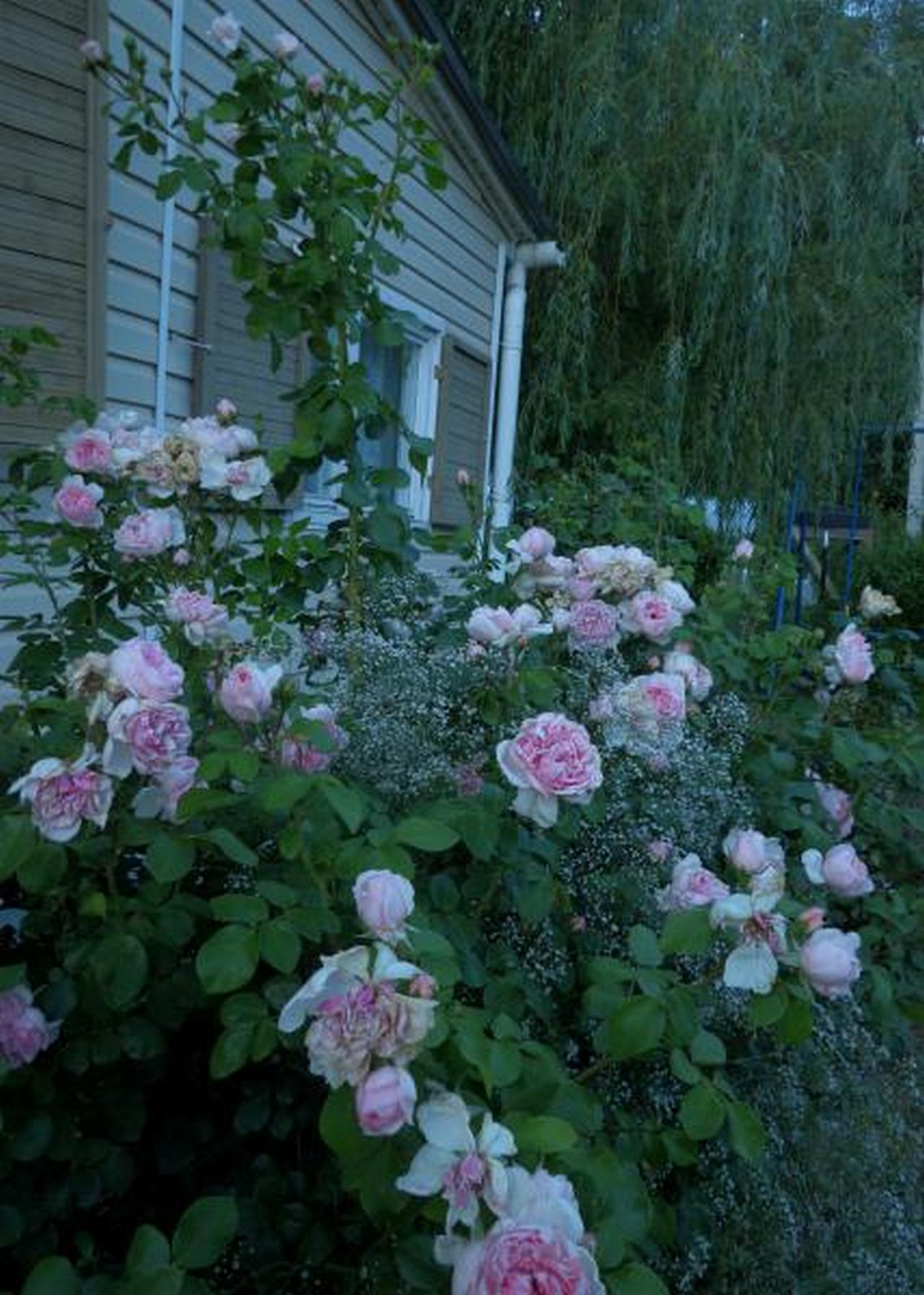 А если туи к дому ближе, ну не растут же розы на все 7 метров? А может что и потемнее, тогда на их фоне и вариегатный бересклет... или он низенький сильно? У меня есть один такой ползучий, сам зелёный, а кайма белая - не могу ему придумать место, с вариегатными сложно, когда нахапалась всяко-разно...