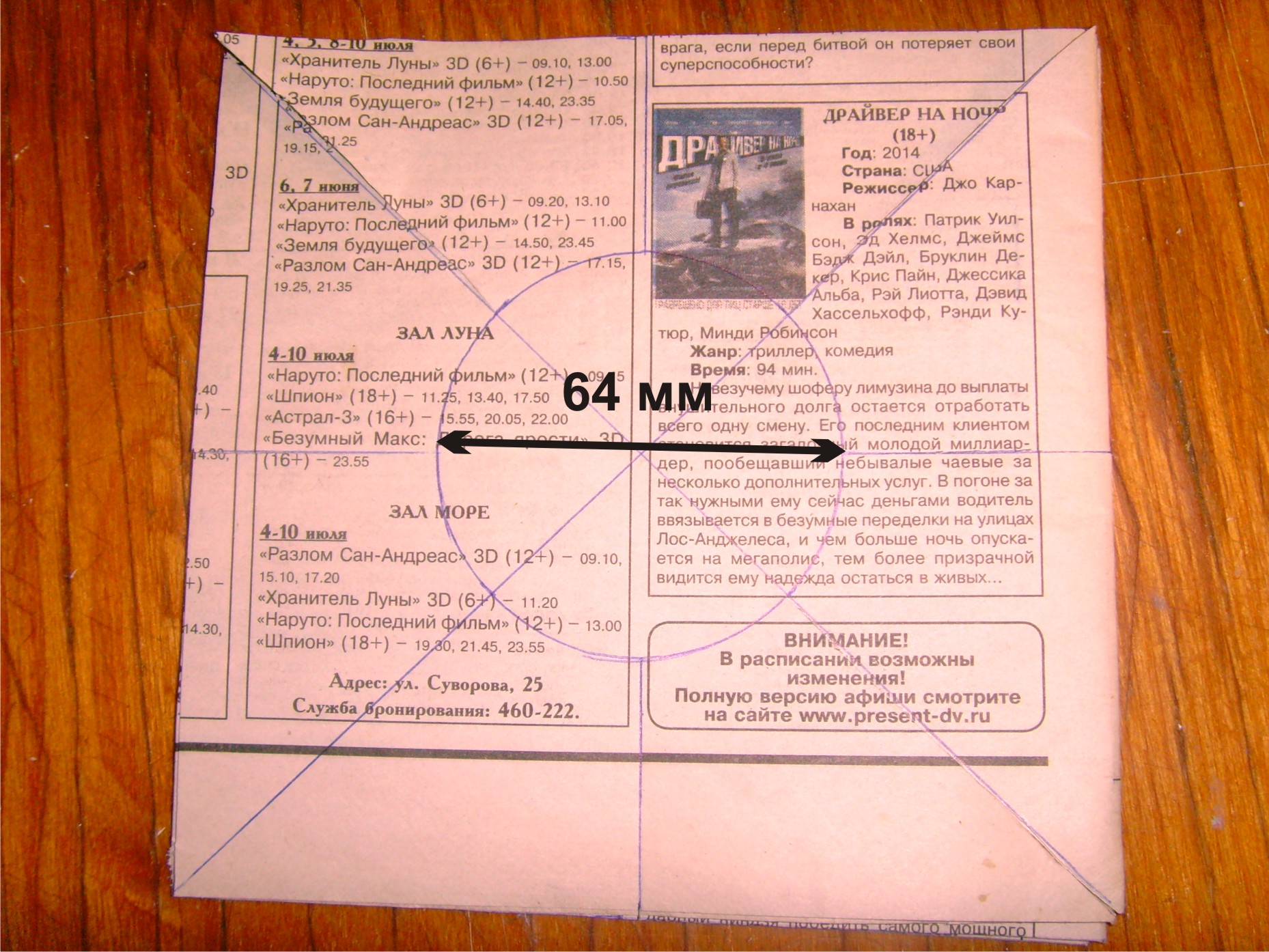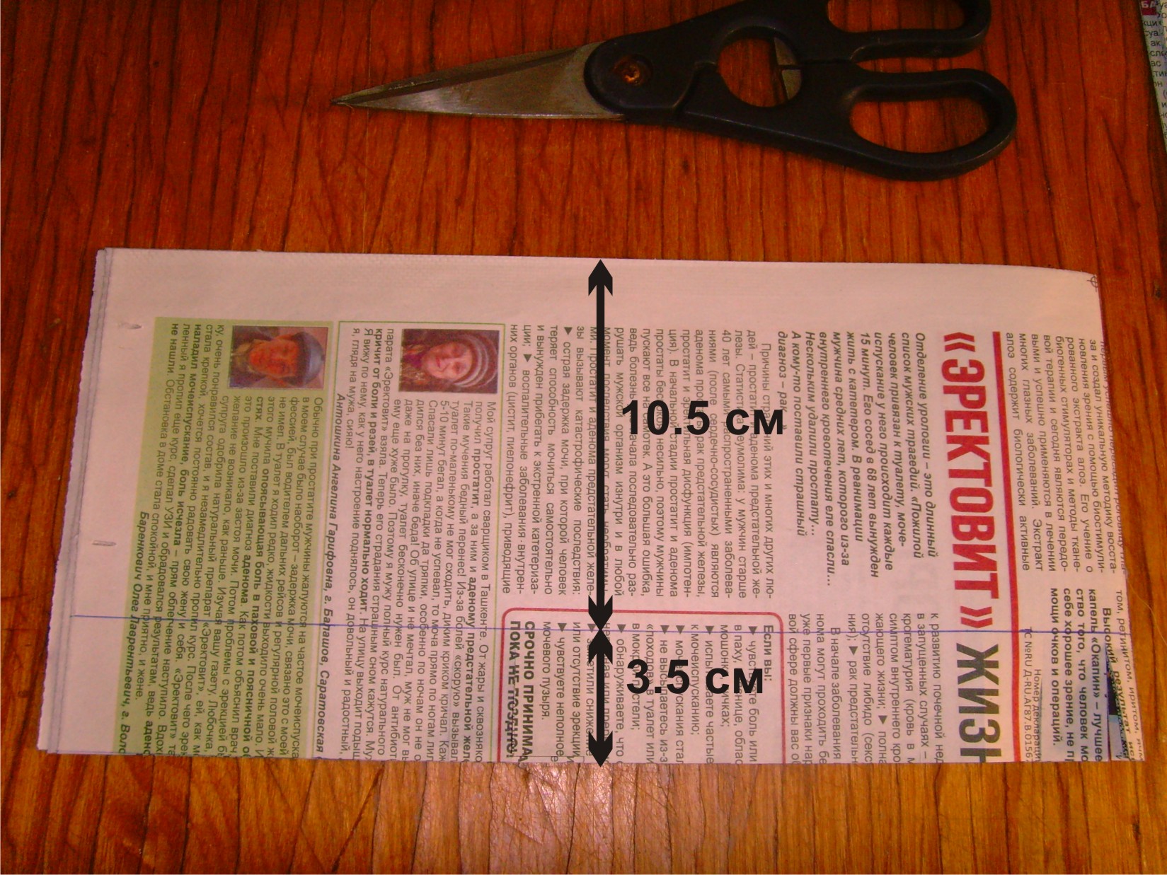 Еще понадобятся ручка, металлическая линейка 50 см, две кисти маленькая (Ø10 мм) и большая ( 40 мм шириной) канцелярский нож и ножницы. Далее делаем разметку на газете. Лучше всего подходят издания имеющие размер полосы 42×58 см. Для боковой детали делим лист по длине на три равные части по 14 см (по этим линиям потом разрезать канцелярским ножом), затем по каждому получившемуся отрезку проводим линию так чтобы получились части по 10.5 и 3.5 соответственно. Ножницами нарезать часть в 3.5 см на лепестки 1.5 – 2.0 см шириной. Для донышка нужны детали 14×14 см, соединить углы по диагонали, найти центр, начертить окружность Ø64мм, соединить боковые стороны через центр. Разрезать (сложив в стопку штук 10) канцелярским ножом от окружности до краев/углов. Можно приступать к сборке.