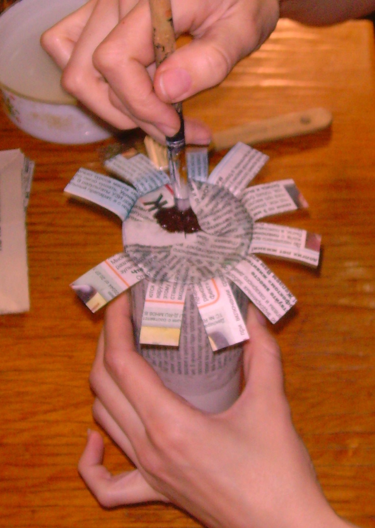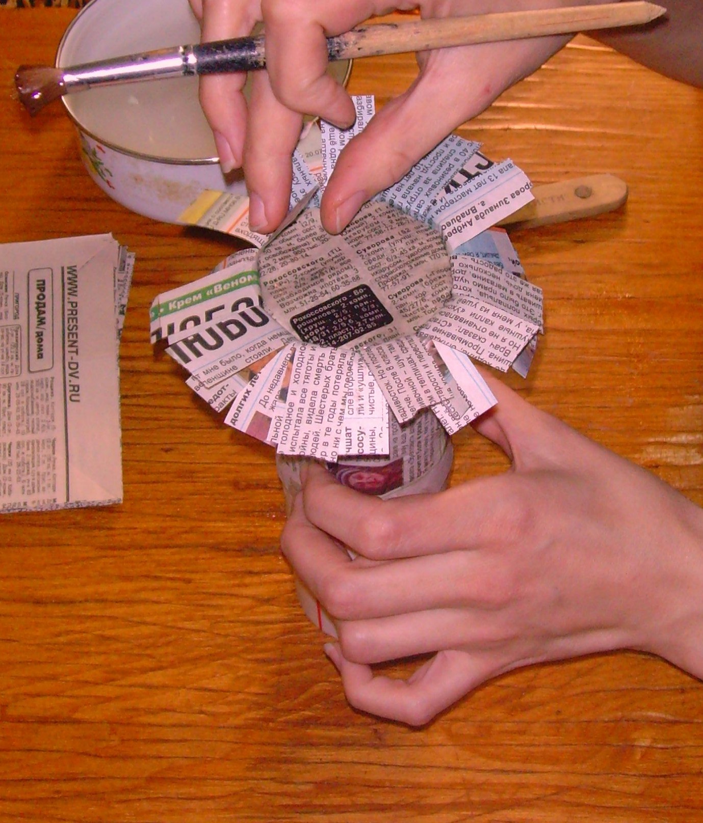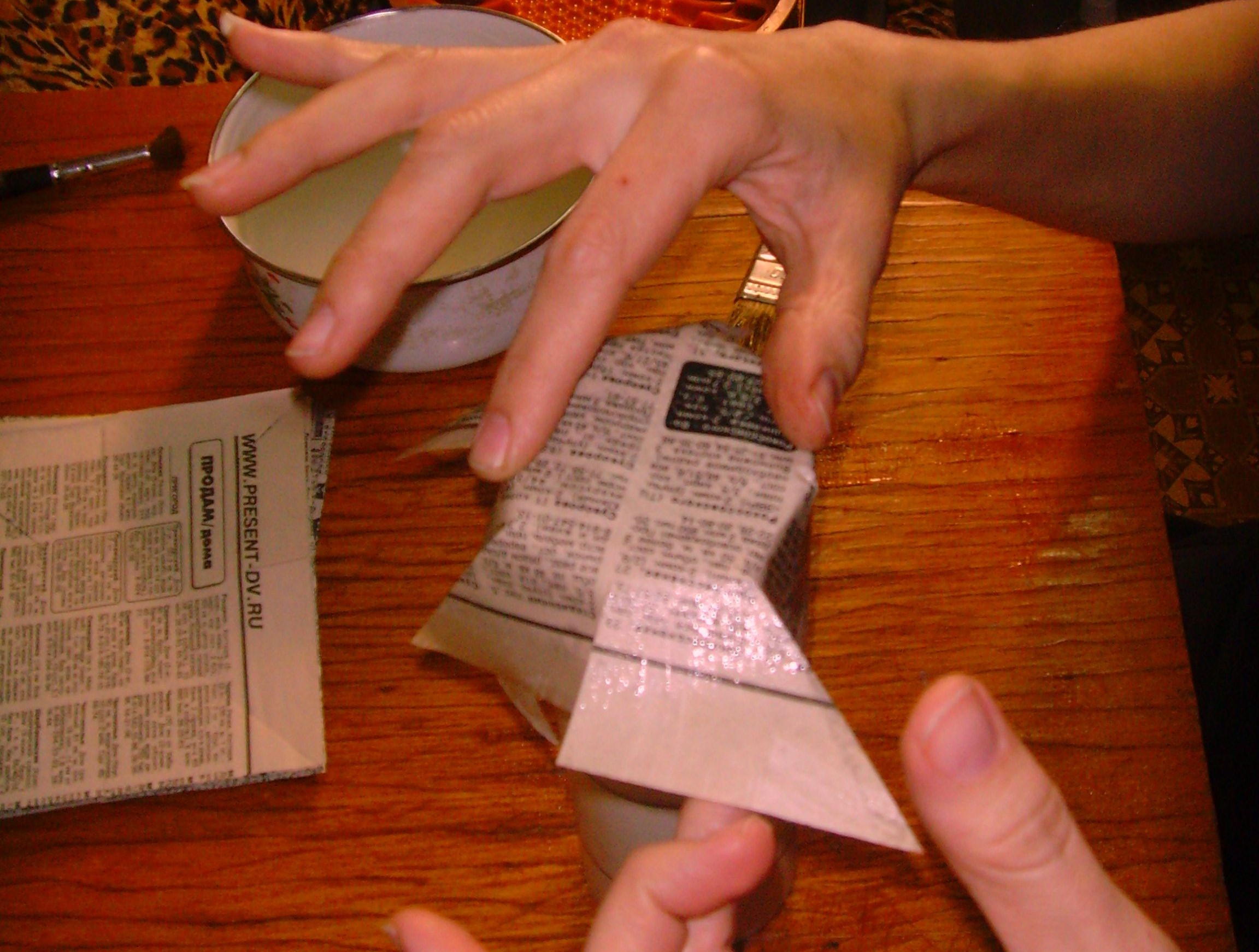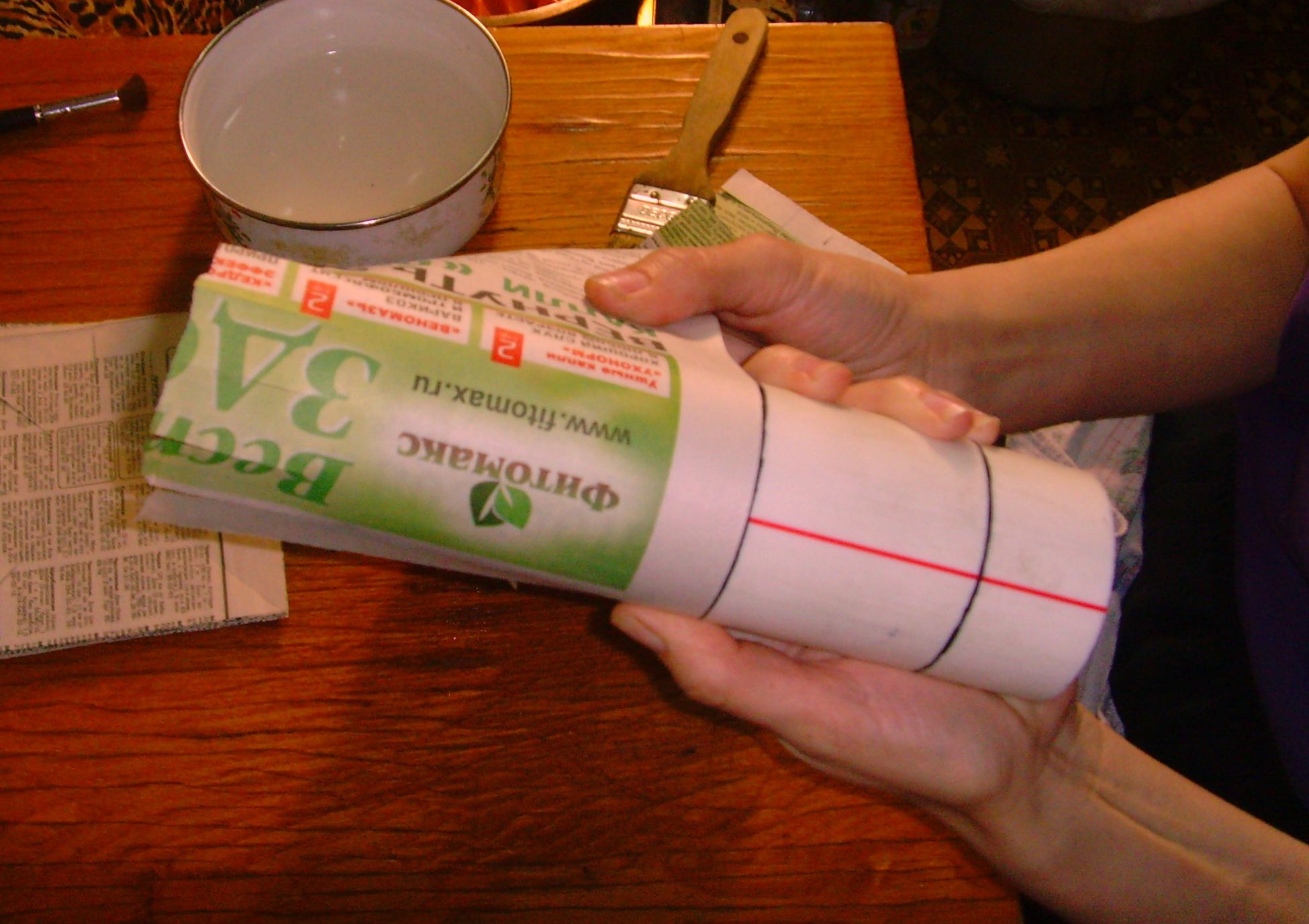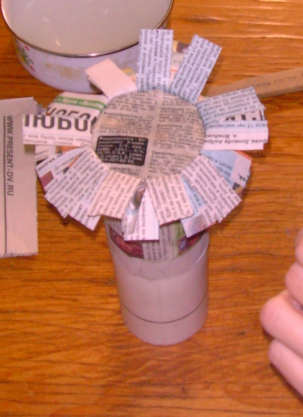 Кладем на стол деталь дна и осторожно, чтобы не порвать наносим клейстер от центра к краям. Затем центруем окружность по торцу трубы и загибаем лепестки, накладывая друг за другом. Важно постараться сильно не заляпать клейстером трубу. Отставляем трубу в сторону и вытираем стол влажной ветошью (до следующего успеет подсохнуть).
