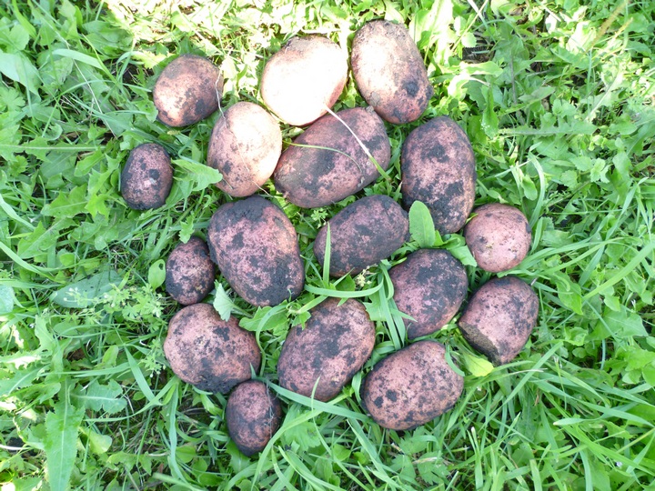Хотела промолчать, но не могу , иной раз выговоришься и полегчает. Начали копать ранние сорта картошки, потому что ботва черная давно. Короче год у нас провальный, такой мелочи давно не выращивали, фитофтора не дала нарастить клубни. Не было б так обидно, если б сидели и ничего не делали. А то и закупила много сортов в прошлом году, провела отбор с лучших кустов, протравила, кормила, опрыскивала, а на выходе то же самое, что и у соседа, который к ней не подходил. Короче только Метеор нарастил приличные клубни. Удивил Жуковский ранний. Посаженный пораньше на летнее потребление выдал приличный урожай, а через три метра, немного позже, один горох,просто шок! В то же время Снегирь был мелкий в прошлом году, а в этом покрупнее, средний получился. Романо - горох, Удача тоже не пошла. Сантэ мелочь, загнулся первый. Ред скарлет средненько на фоне других гороховых . Еще пару сортов глянули, там тоже слабо, но пока ботва немного держится, пусть стоит, мож чего нарастет еще.