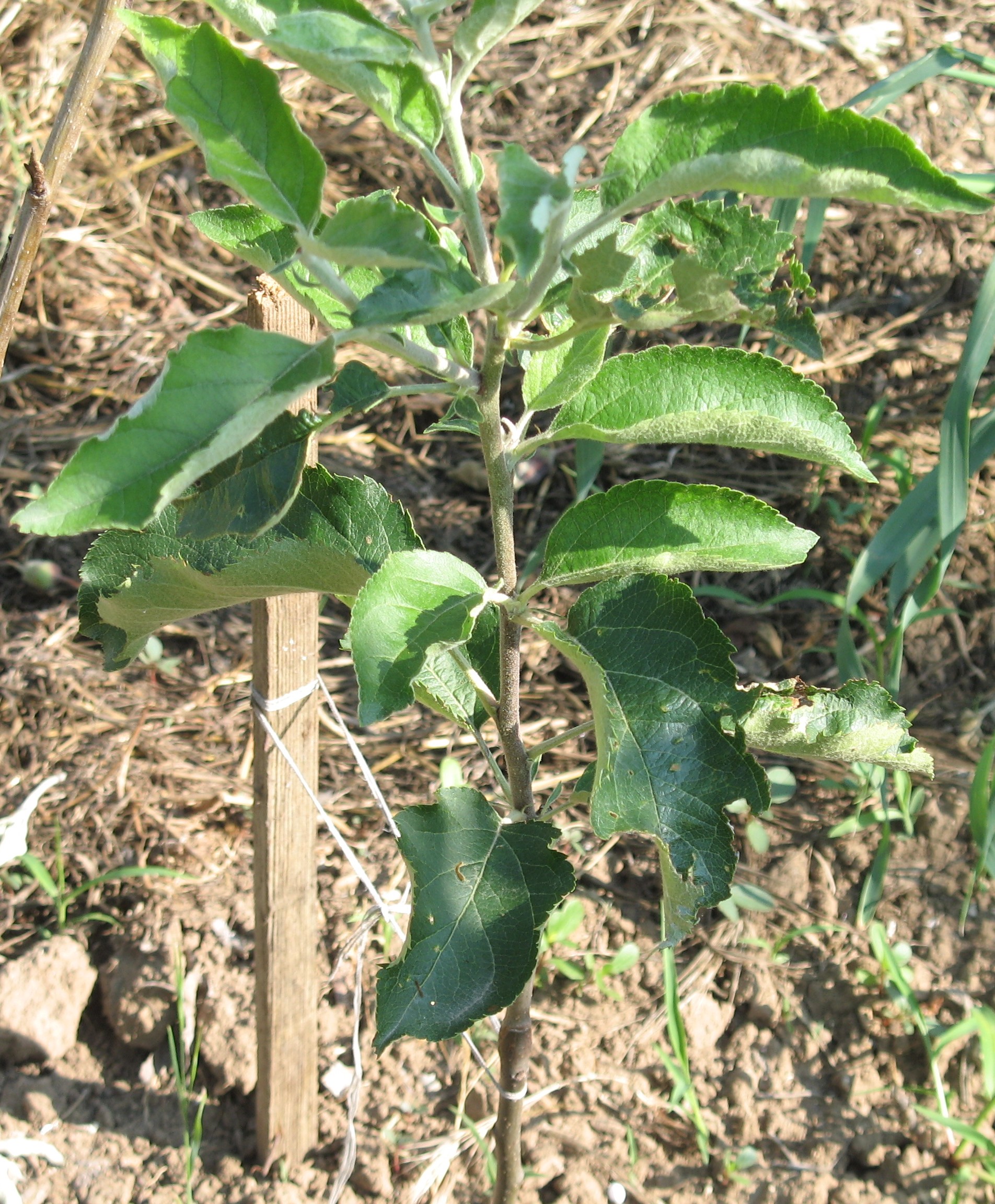 В этом году какая-то з-за, не успеваешь заметить, съедает верхушки у яблоневых прививок. Потом рост восстанавливается. Но вот один саженец задал задачу, выстрелив вверх сразу тремя побегами. Два в стороны смотрящие я кликнул на боковые почки, не трогая более слабый, но почти вертикальный (фото). Теперь в раздумии: наверное, неправильно, надо было боковые полностью выломать?