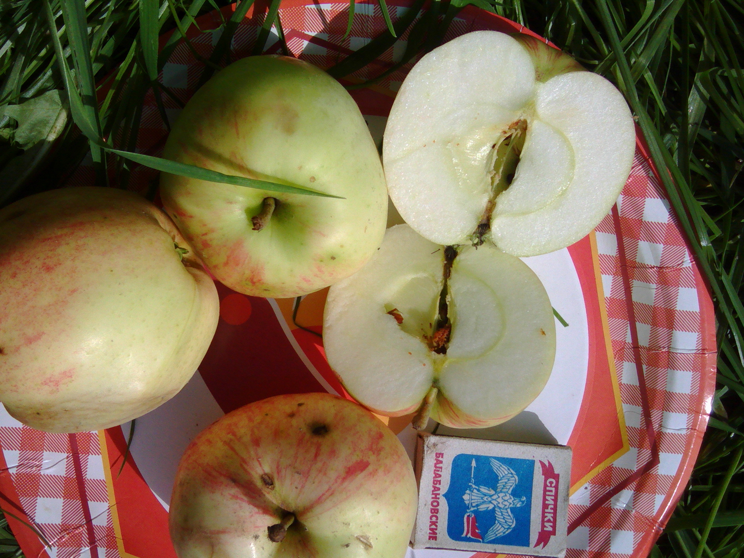 Больше на Белый налив смахивает, только мякоть более плотная, не такая каша. Насчёт Грушовки Московской это Вы хорошо напомнили надо попробовать найти более менее созревшее яблоко и сравнить их.
