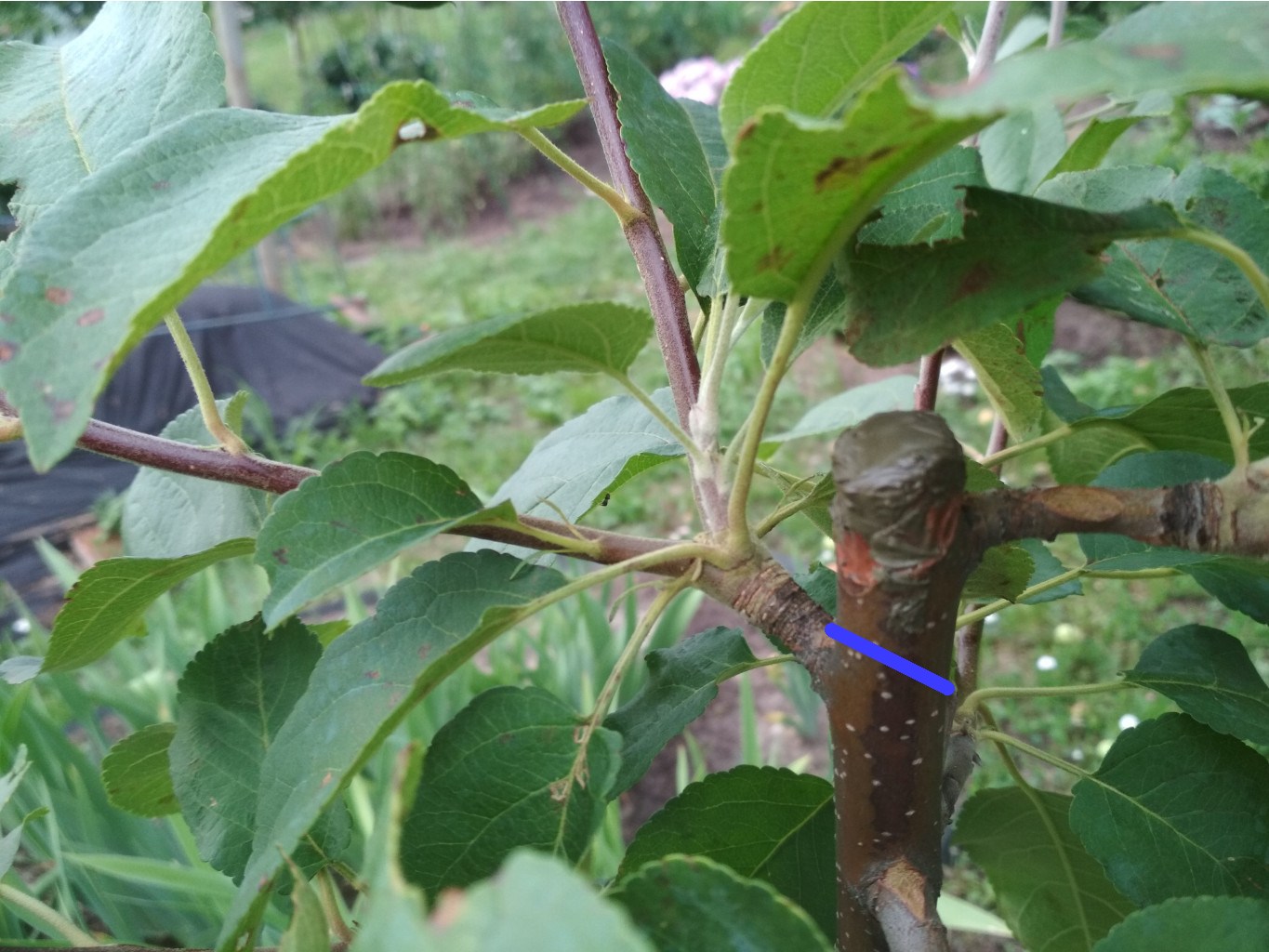 Спокойствие, только спокойствие. Вертикальное положение сформированному и одревесневшему плодовому прутику длиной не более 10см придать очень проблематично, отломится нафиг. Вот сейчас он дал хороший прирост, который и был загнут вертикально, как положено. Да если дерево выживет и вырастет будет кривоватый цп, но это не критично. Пенек специально длинный оставил, ессно его удалю если всё нормально будет и омертвление коры не пойдёт ниже.