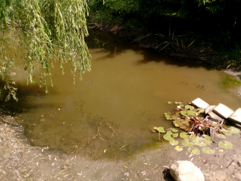 Но полностью не высыхает. Он глубокий - больше трёх метров. Мальчишки даже ныряли, когда росли берёзы, наклонившиеся над прудом. Привязывали тарзанку к берёзе и прыгали в воду. Но берёзы пришлось спилить, сейчас не придумаю, как использовать пни.