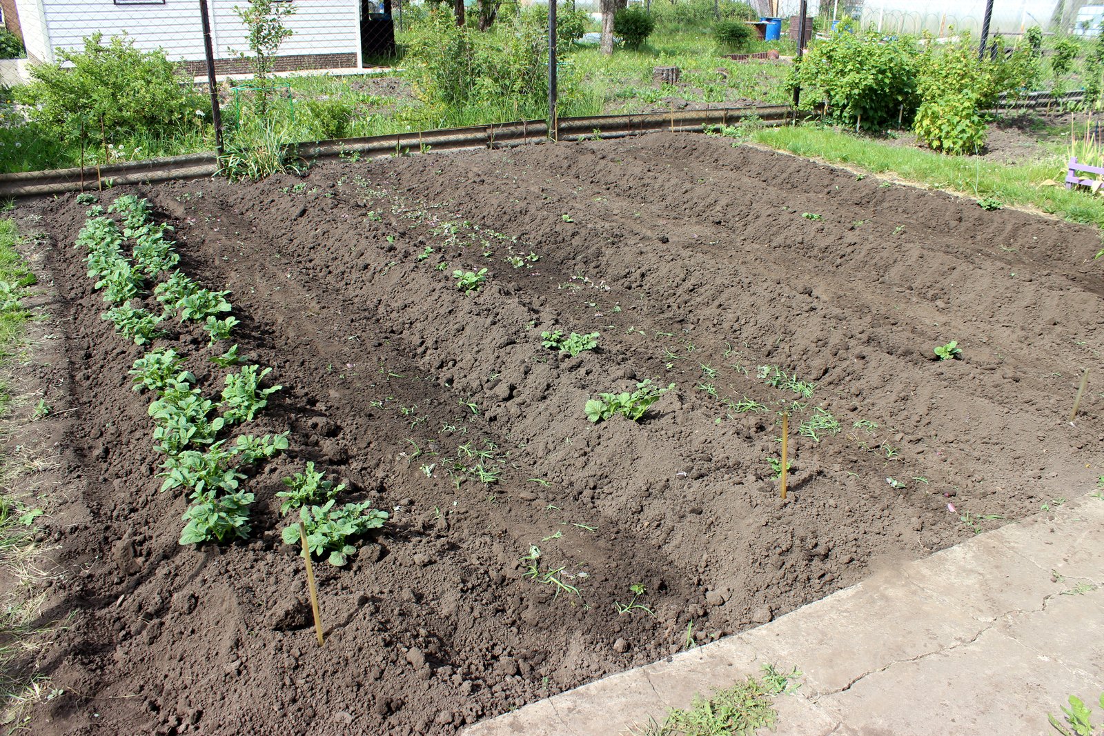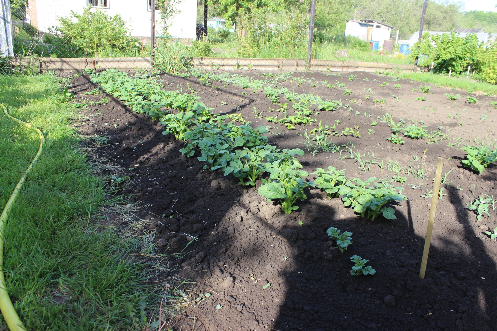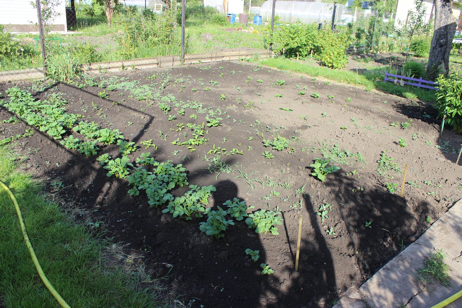Из-за майской зимы очень большая разбежка по всхожести между ранними и тугодумными желтыми сортами. Посадочную привез в деревню в конце апреля, с расчетом на проращивание 3 недели, после первых майских снег, дождь, минуса, две с лишним недели не приезжал, толком не прогрел. Для сравнения КА покупная из магазина (указывает тень) растет наравне с ранними. А свою из ямы, левее и продолжение ряда
