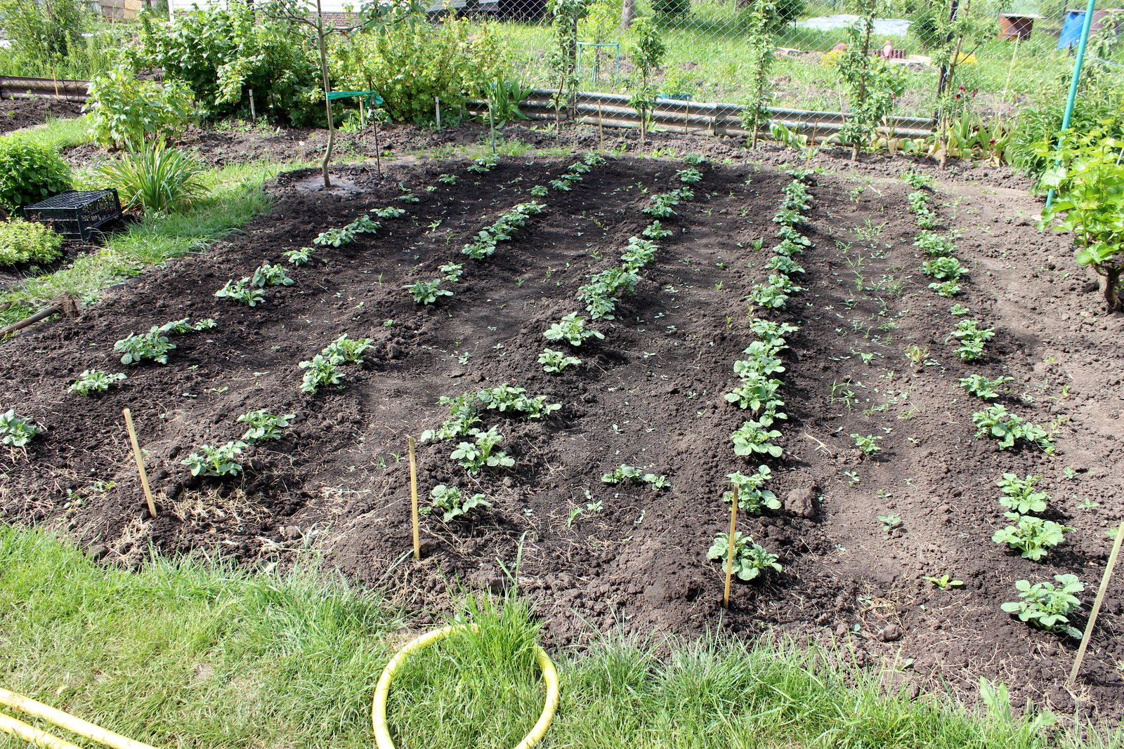В этом году экстремальная погода - то холод и проливные дожди, то жара больше +30 - в результате не все ещё посажено (капуста, томаты). Картофель сажали растянуто: первая посадка 18 мая, последняя - 02 июня. Несмотря на то, что семена были с хорошими ростками, всходит неравномерно. Первая партия уже хорошие кустики - Венета (думала что не оставила на семена) и Инара, последняя партия только начинает всходить.